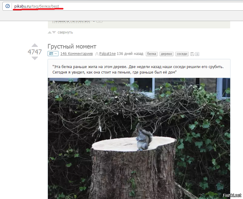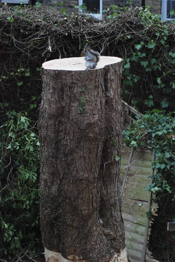 Эта белка раньше жила на этом дереве. Две недели назад наши соседи решили его срубить. Сегодня я увидел, как она стоит на пеньке, где раньше был её дом.