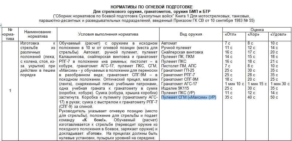 Согласно: НОРМАТИВЫ ПО ОГНЕВОЙ ПОДГОТОВКЕ ("Сборник нормативов по боевой подготовке Сухопутных войск" Книга 1 Для мотострелковых, танковых, парашютно-десантных и разведывательных подразделений, введённый Приказом ГК СВ от 10 сентября 1983 № 55), норматив на «отлично» для пулемёт СГМ («Максим» (УР) составляет 35 сек., ну отбросим 10 сек. на расстояние расчёта до оружия 10 м и разобранность со станком, всё равно это составляет 25 сек.(!)