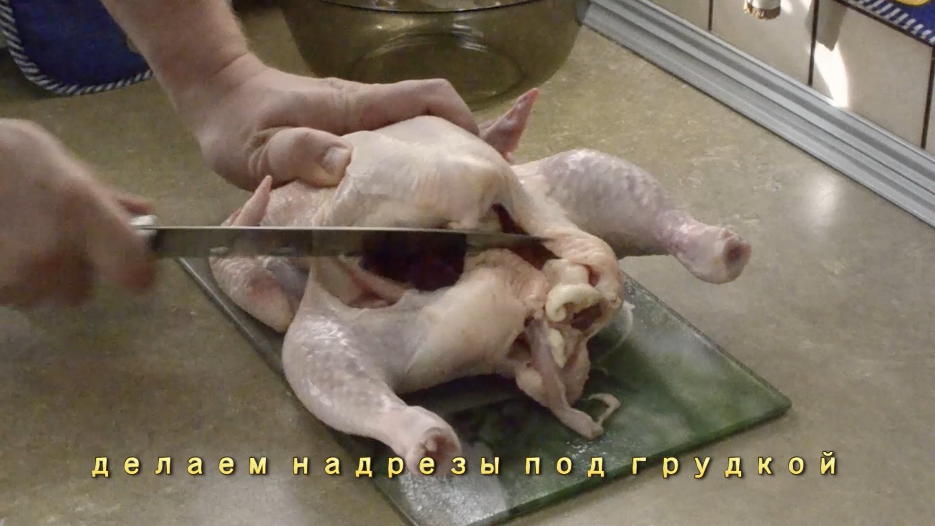 2. Переламываем тушку пополам и отделяем нижнюю часть от грудной части