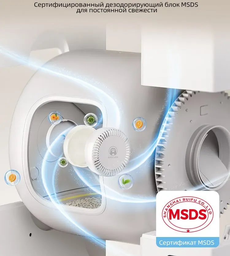 Главное преимущество девайса в том, что он самоочищающийся. Больше никакой ручной уборки и при этом постоянная свежесть. Самоочистка запускается сразу после посещения питомцем туалета. Далее отходы автоматически упаковываются в герметичные пакеты, что препятствует распространению запахов.