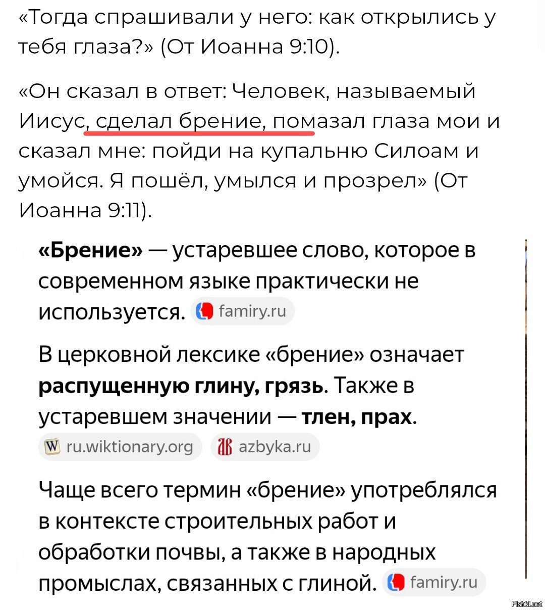 «Он сказал в ответ: Человек, называемый Иисус, сделал брение, помазал глаза мои и сказал мне: пойди на купальню Силоам и умойся. Я пошёл, умылся и прозрел» (От Иоанна 9:11).