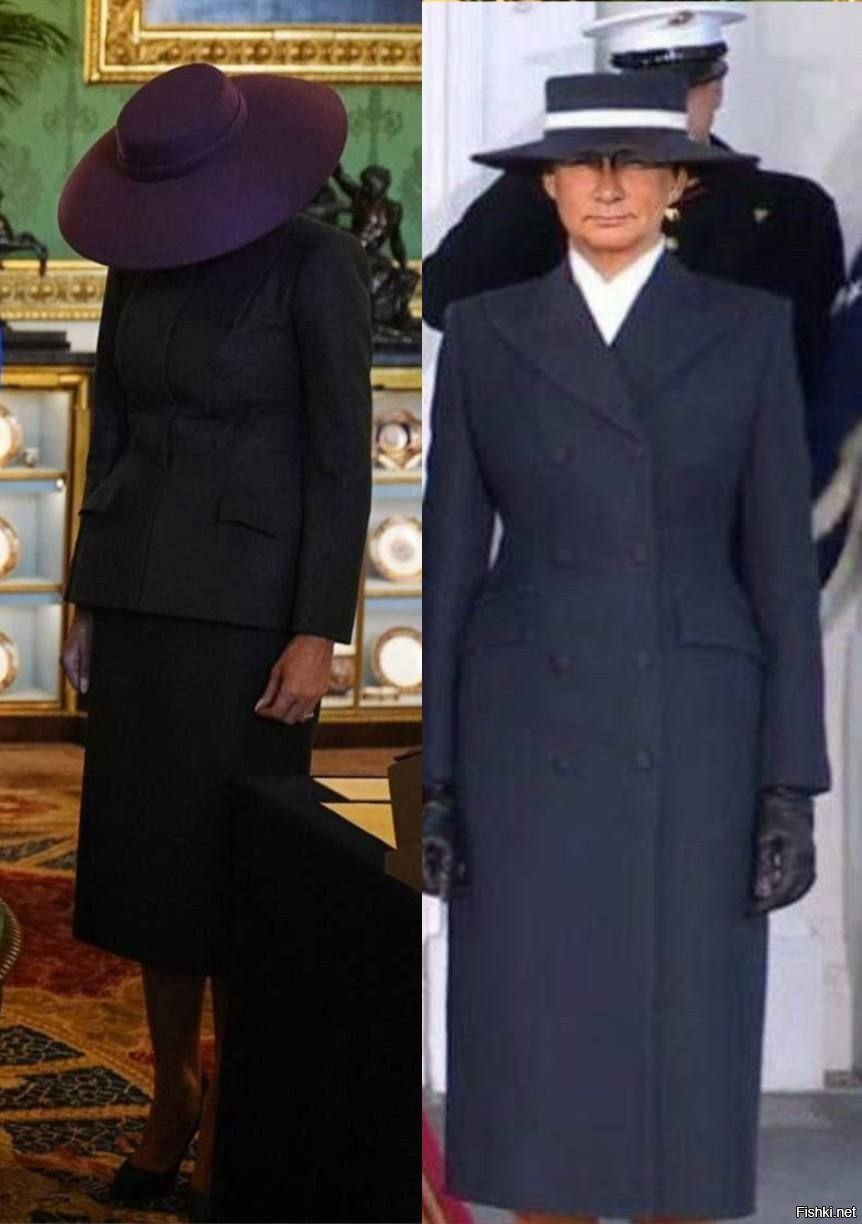 Кстати, Мелания там тоже не слабо звездила. Она появилась в драматичной фиолетовой шляпе с широкими полями от Dolce & Gabbana, которая частично скрывала глаза, напомнив о её инаугурационной чёрной шляпе в 2017 году.