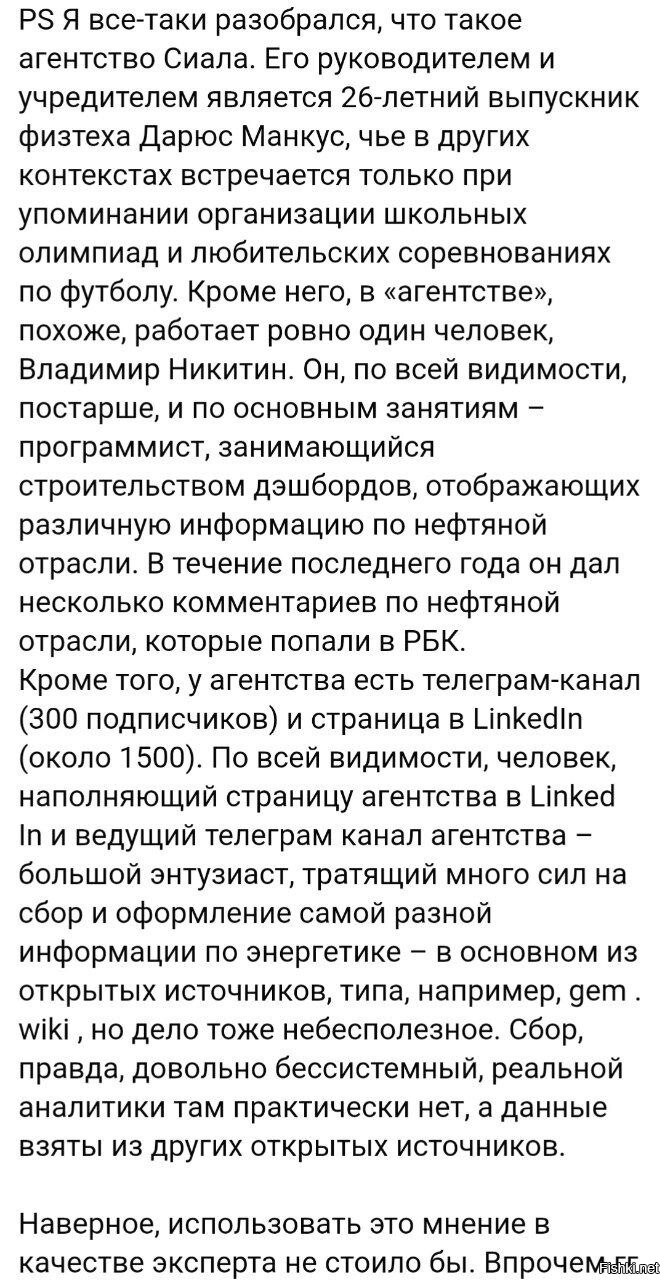Агентство Сиала выдавшее новость про 38% состоит из одного человека. Его владелец 26-летний футбольный энтузиаст и нефтяной неофит без профильного образования. Почему на него ссылается РБК с сенсацией отдельный вопрос к компетенции. @banksta