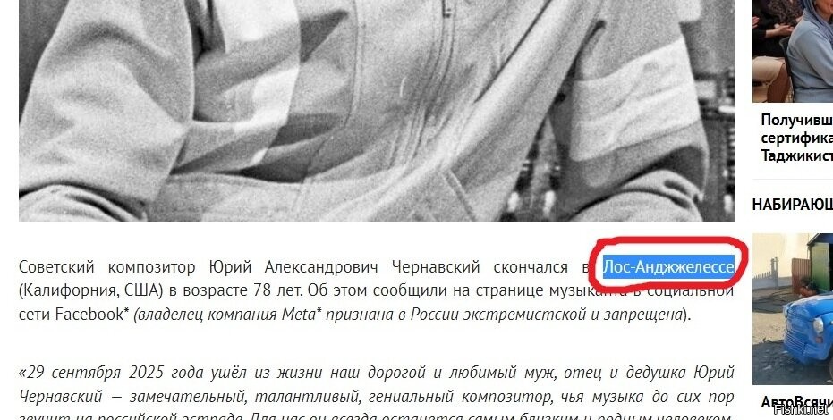 «29 сентября 2025 года ушёл из жизни наш дорогой и любимый муж, отец и дедушка Юрий Чернавский — замечательный, талантливый, гениальный композитор, чья музыка до сих пор звучит на российской эстраде. Для нас он всегда останется самым близким и родным человеком, примером силы, доброты и вдохновения. Его музыка будет жить в сердцах людей, а память о нём — в нашей семье навсегда. Семья глубоко скорбит и просит всех, кто знал и ценил его, сохранить светлые воспоминания», — говорится в некрологе.