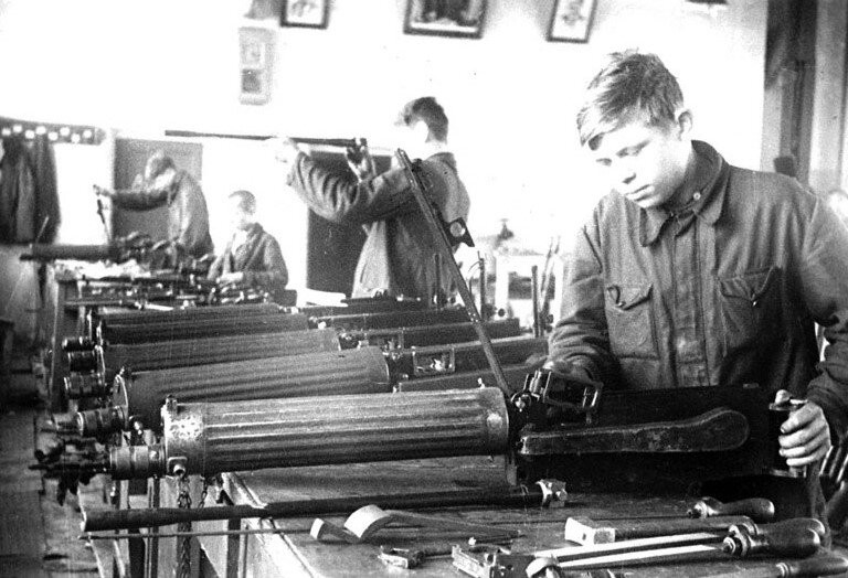 Во время войны особенно тяжело приходилось детям. Им пришлось работать на заводах, в колхозах, на полях, воевать в партизанских отрядах и на фронтах, жить на оккупированных территориях и многое, многое другое. Сегодня хочется вспомнить о детях военного поколения, которые трудились в тылу наравне со взрослыми. Вглядитесь внимательно в эти ставшие в одно мгновение взрослые лица детей. Еще до войны на территории Советского Союза появилось Главное управление трудовых резервов. Управление распределяло подростков по училищам. Во время войны подростков призывали на фабрики и заводы. Около 8 тысяч детей работало только на моторостроительном заводе в Перми. Завод выпускал авиадвигатели. Рабочим было всего по 14 лет, на неквалифицированную работу брали уже с 11 лет. Вспоминая свое военное детство, бывший работник завода вспоминал, что когда уходил в 14 лет, его мама плакала и все спрашивала: "Зачем такому маленькому идти?" С мамой он встретился только после войны в 1946 году, и опять она плакала: "Ты даже не вырос за эти годы". А как тут вырастешь? Если работать иногда приходилось по 29 часов подряд. Правда, после такой смены давали отдых и сытный обед. Да и вообще тяжело приходилось детям, приехавшим издалека на заводы в тыл. Одежды и обуви толком не было. Донашивалось то, что привозили из дома. Очень часто дети даже не уходили ночевать домой - оставались на заводе (спали на ящиках, в кочегарках, в любом свободном уголке). Руководители заводов постепенно стали шить одежду для детей, покупать валенки и другую обувь. Потом это все распределялось между детьми.