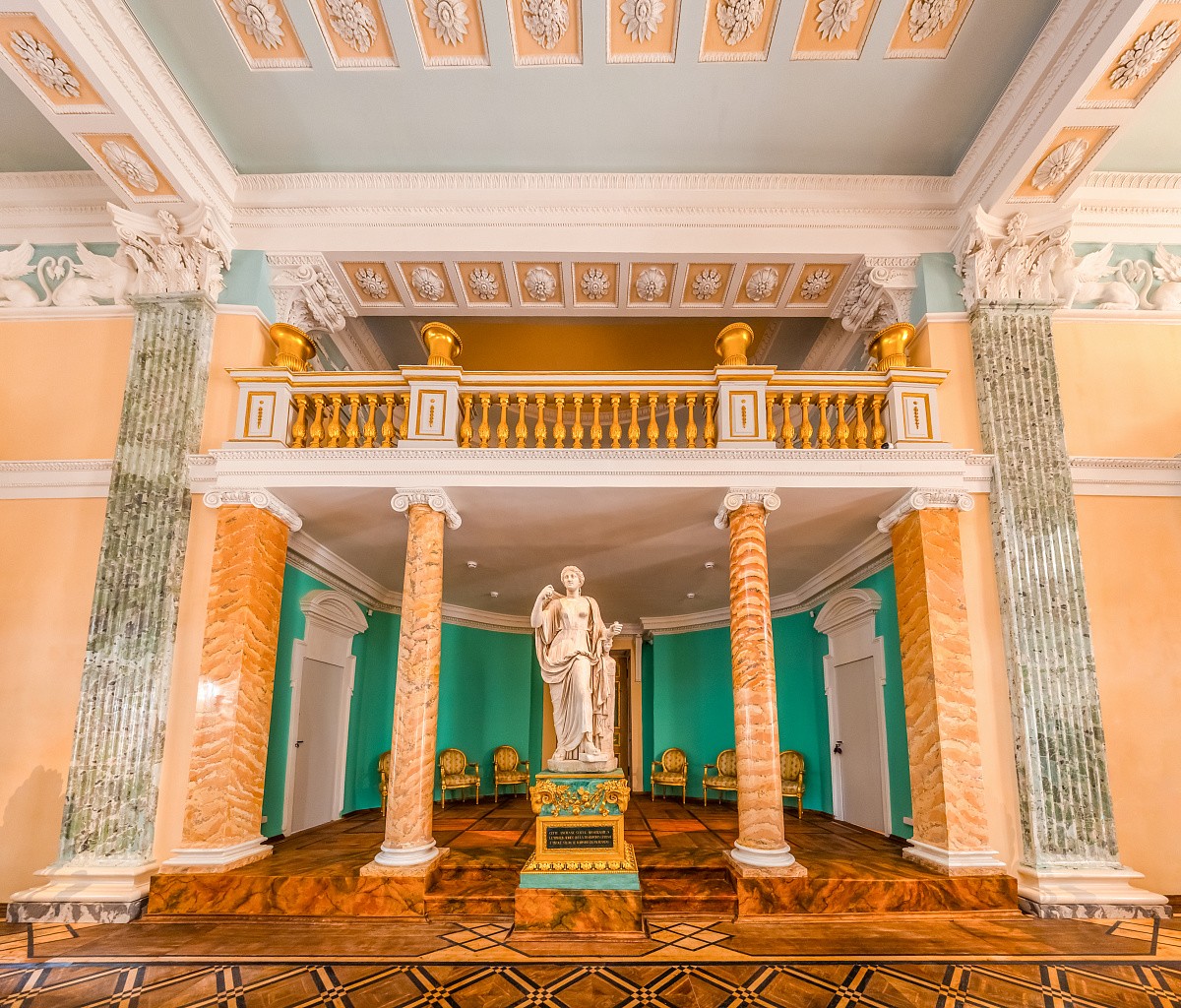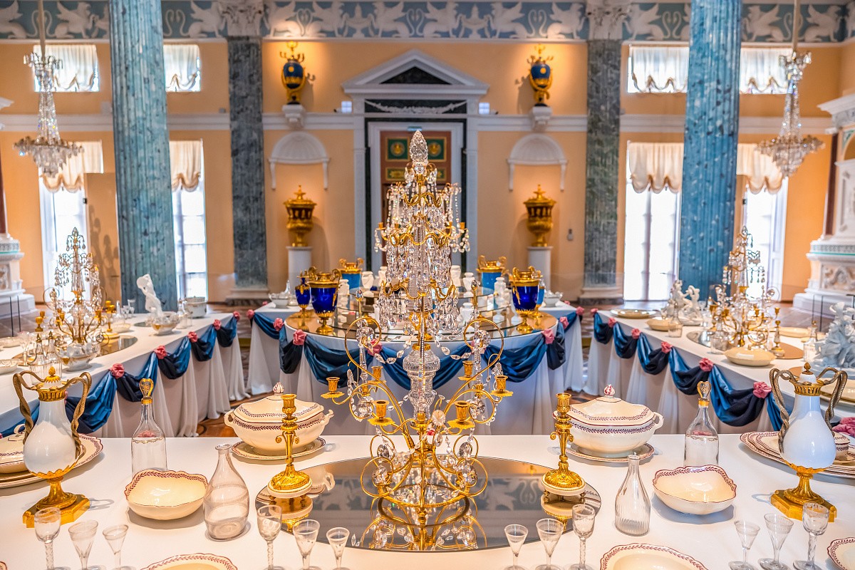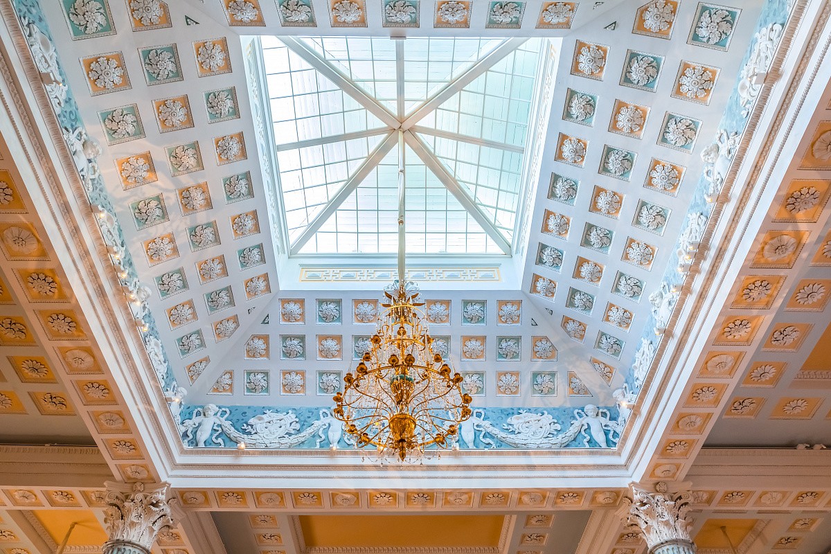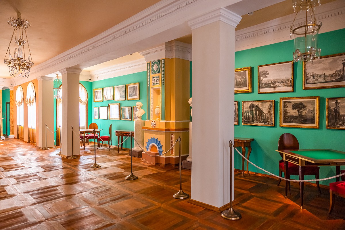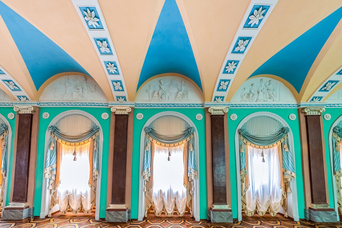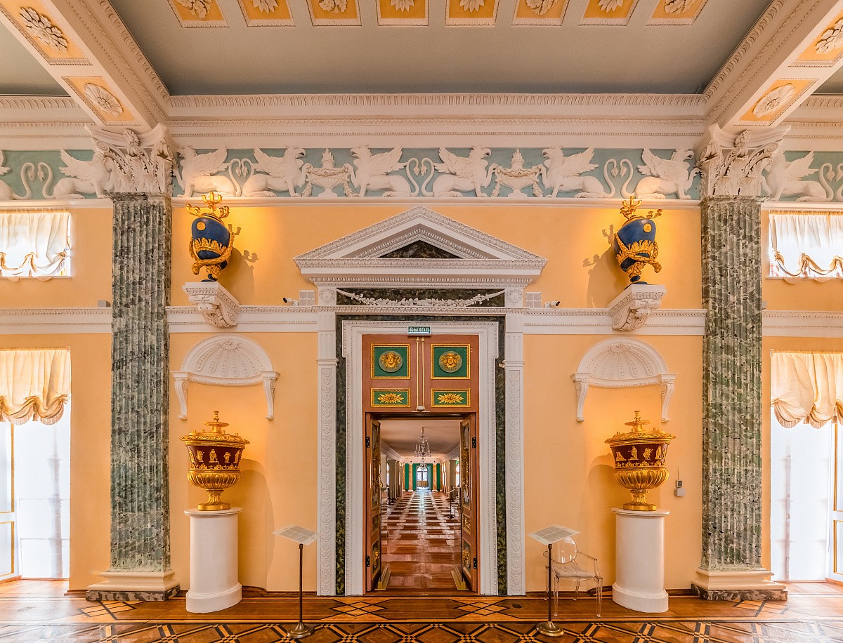 Реставраторы восстановили более 700 кв. м подлинных художественных паркетов, сложные дверные полотна, украшенные позолоченной и посеребренной резьбой, искусственный мрамор, элементы фурнитуры, лепной декор и исторические печи со скульптурами сфинксов.