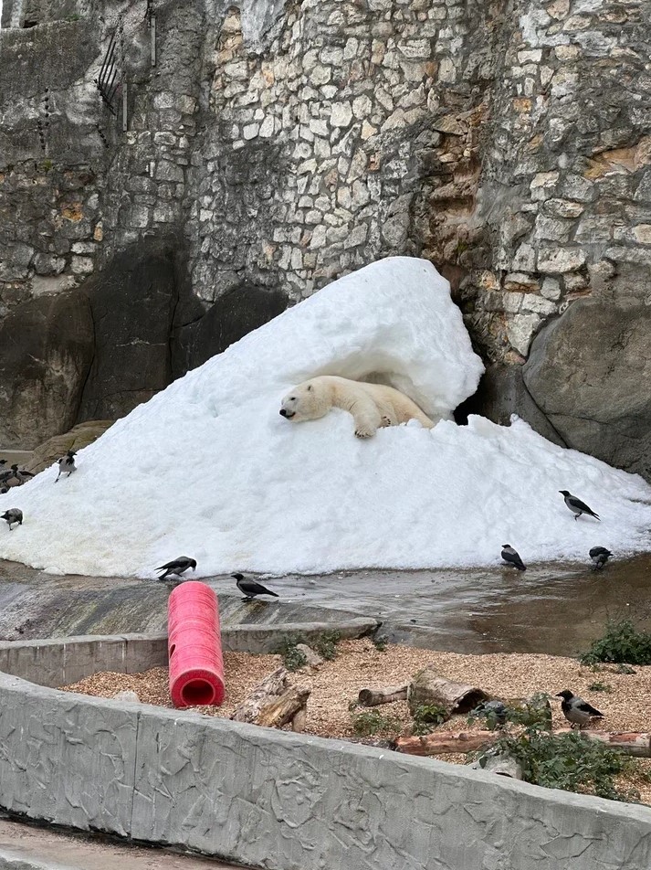 Катаясь в снегу, животные охлаждаются, роют лунки, а киперы прячут там мясо и рыбу, чтобы хищники могли реализовать инстинкт охотника. Снегом медведей нужно обеспечивать круглый год, поэтому в вольере установлен ледогенератор.