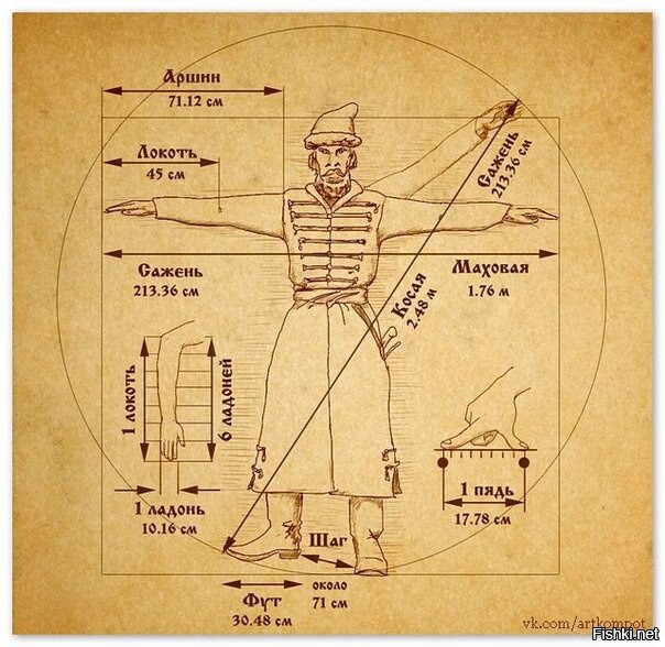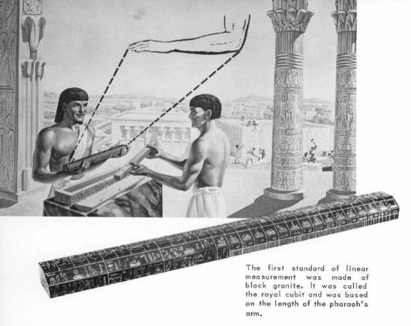 Одним из древнейших эталонов для измерения длины была длина предплечья египетского фараона — от локтя до кончика среднего пальца. По этому стандарту изготавливались измерительные линейки, называемые «локтями» (кубитами), которые использовались при строительстве пирамид.