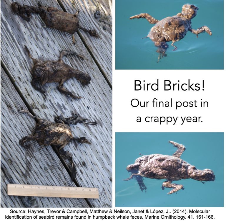 Киты могут случайно проглотить птиц во время кормёжки, но поскольку они не способны переварить птицу, то выводят их наружу целиком. В народе такие образования называют «птичьими кирпичами».
