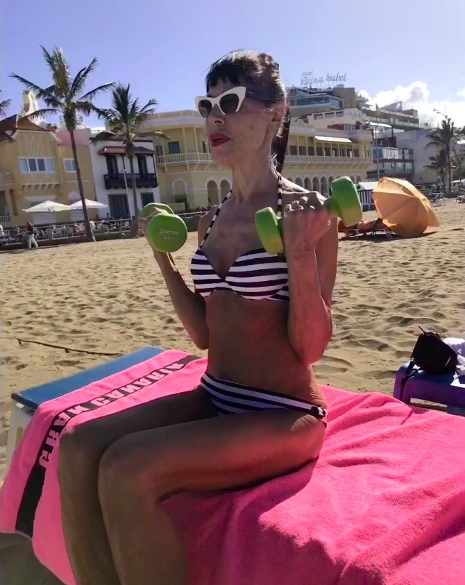 Она призналась: «Когда мне было чуть больше двадцати, я стеснялась носить бикини. С возрастом моя уверенность в себе и самооценка росли. У меня не было идеальной физической формы до 60 лет. Теперь я могу проплыть 60 олимпийских дистанций чуть более чем за час. Я много катаюсь на велосипеде и прохожу 8 км каждый день».