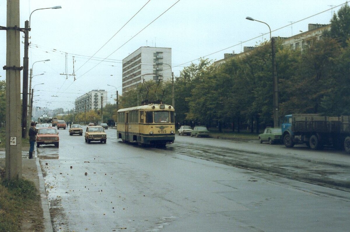 Перенесёмся на северные окраины (тогда именно окраины) города. Трамвай ЛМ-57 32 маршрута следует по проспекту Науки.