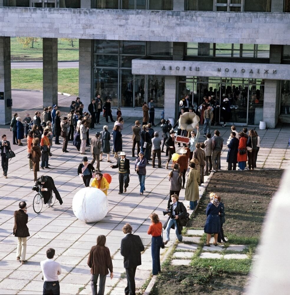 Артисты экспериментального театра пантомимы и клоунады "Лицедеи" около Ленинградского дворца молодёжи.