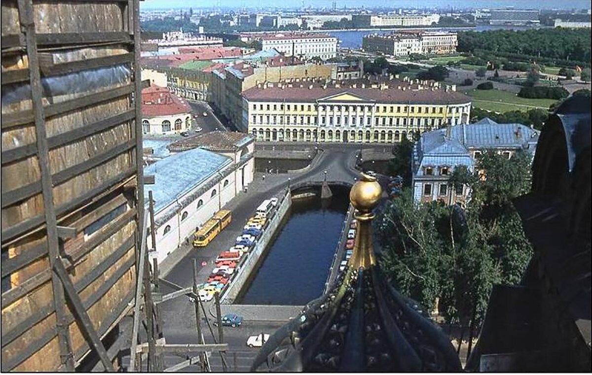 Вид с одного из куполов Спаса-на-Крови. Тройной мост ещё является автомобильной дорогой и по ней даже ходит автобус.