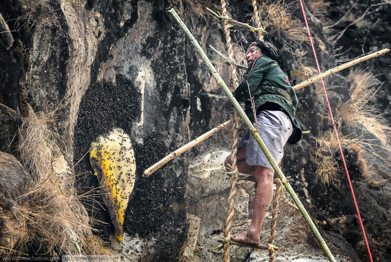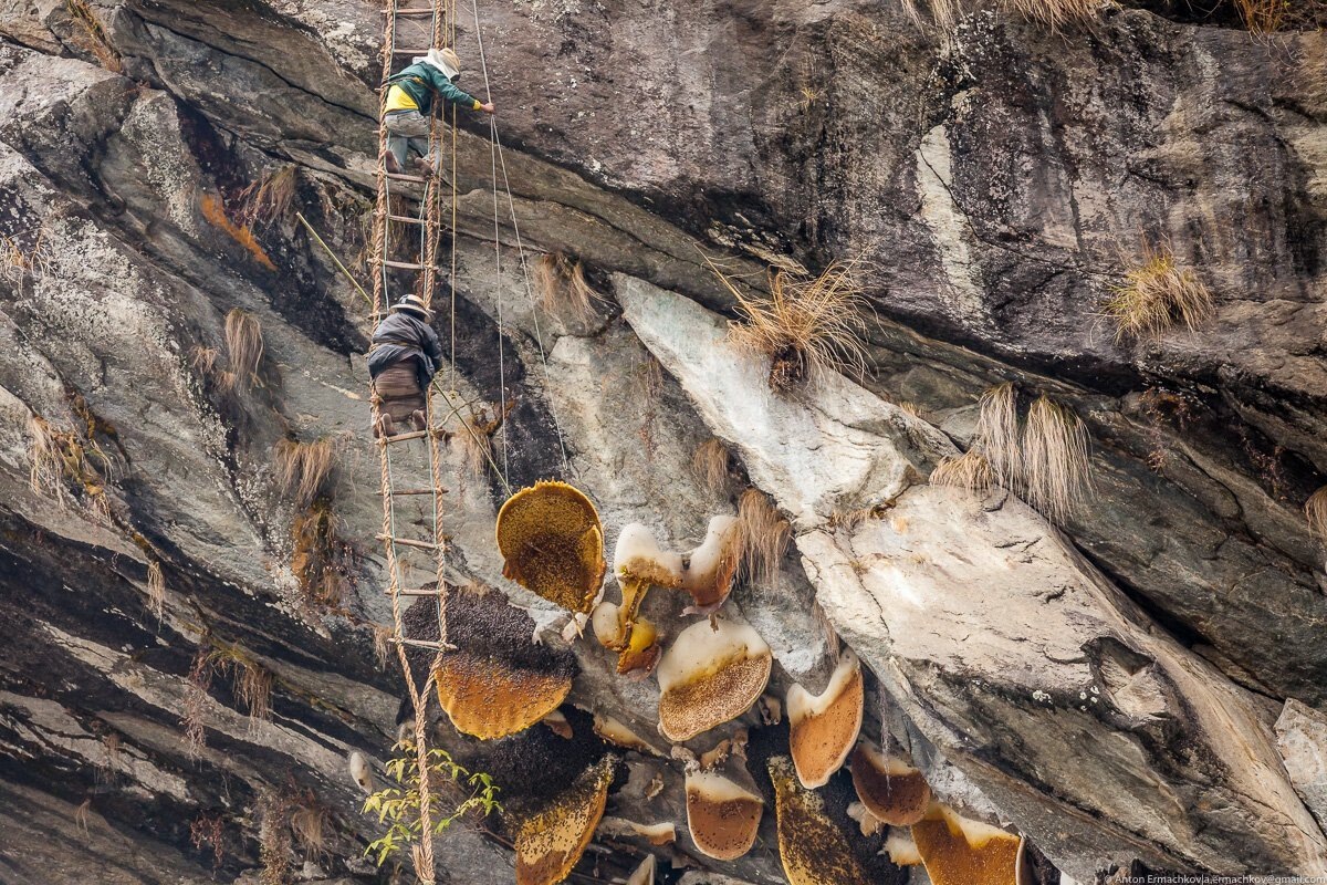 Поэтому на добыче мёда гигантских пчёл местные построили грубую и крайне суровую индустрию. Они задымляют пчёл кострами, после чего взбираются на десятки метров вверх по отвесным скалам при помощи веревочных лестниц с деревянными перекладинами. Без страховки и какой-либо защиты. Полученный таким образом товар стоит безумно дорого, в среднем 1 доллар за грамм, но основную прибыль получают торговцы красным мёдом. Бортники-альпинисты же зарабатывают на смертельно опасном ремесле ровно столько, сколько нужно, чтобы прокормить семью.