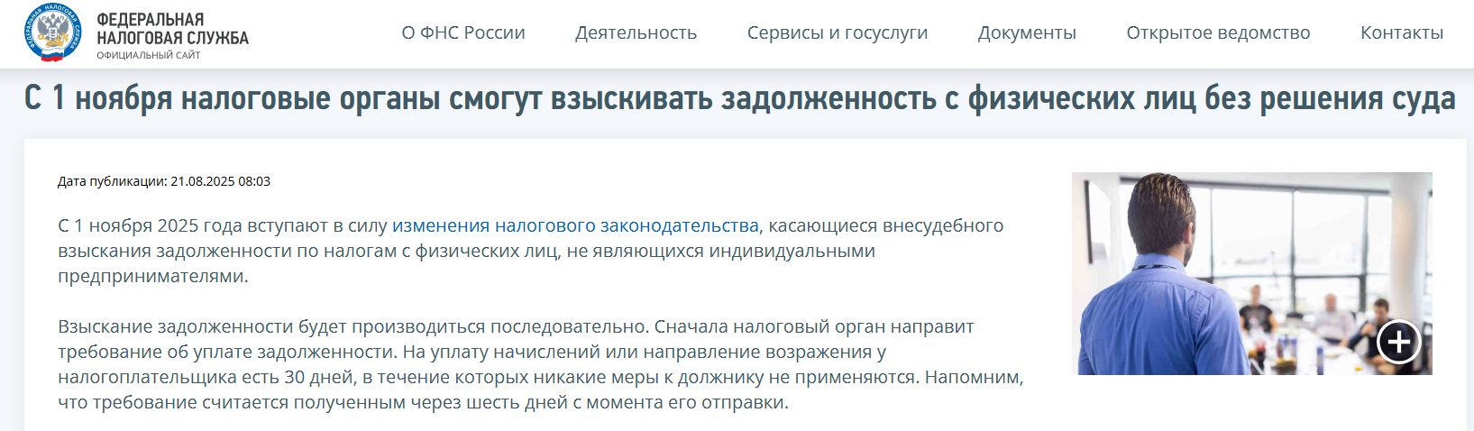 С 1 ноября 2025 года в России вступает в силу новый порядок взыскания налоговой задолженности с физических лиц, который позволит Федеральной налоговой службе (ФНС) проводить такие процедуры без обращения в суд. Это предусмотрено Федеральным законом от 31 июля 2025 года № 287-ФЗ "О внесении изменений в статью 46 Налогового кодекса Российской Федерации".