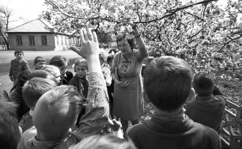 Павлышская средняя школа. Ребята с учительницей в цветущем саду. 1972 год. Всеволод Тарасевич.