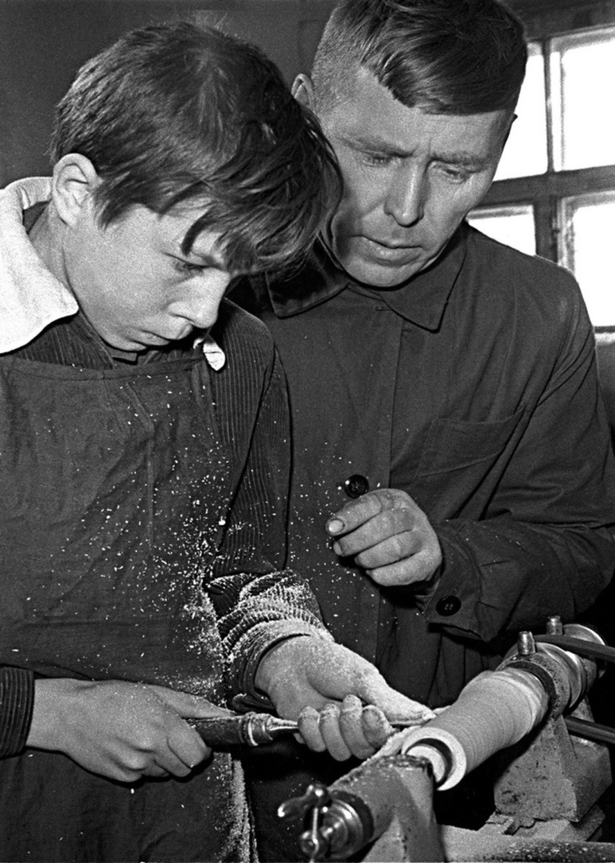 Совхоз «Уйский». Ученик 6-го класса А. Бутырнин и преподаватель по труду К. В. Вандышев в школьных мастерских. 1960-е годы. В. Георгиев.