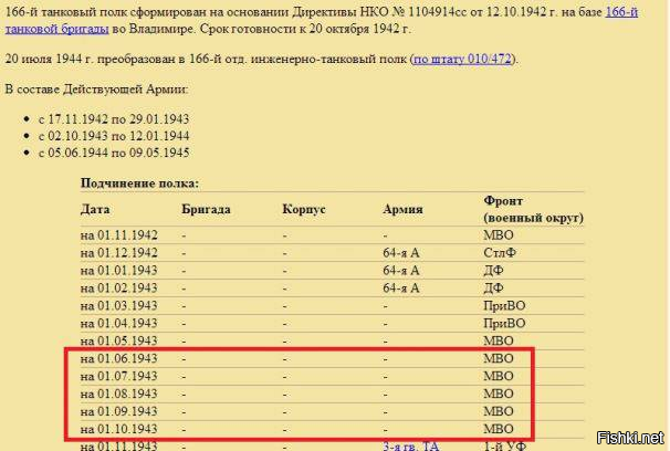 Подтверждение этому мы находим на вышеупомянутом сайте «Танк Т-34. Виртуальный музей», где сказано, что 166-ой отдельный инженерный танковый полк находился в резерве Главного командования и предназначался для прорыва вражеской обороны во время битвы на Курской дуге. Но о его применении под Курском не сказано ничего. Смотрите картинку ниже.