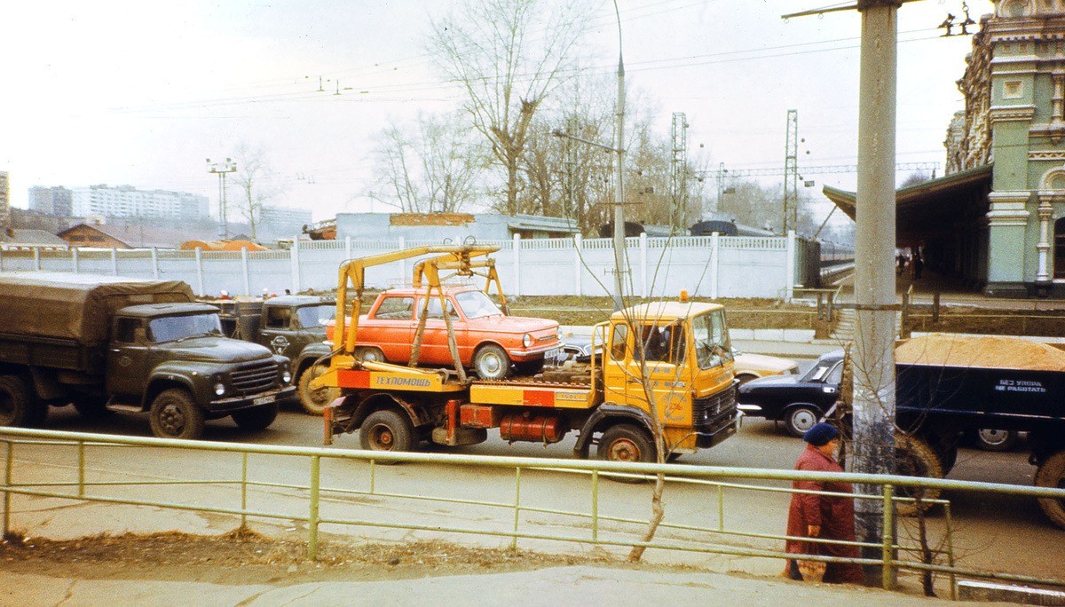 У Рижского вокзала модный эвакуатор "Магирус" куда-то тащит "Запорожец".