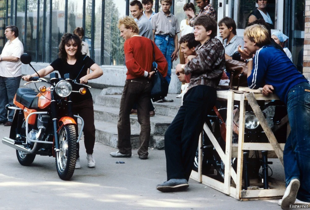 Самая счастливая девушка в мире катит новенькую покупку из магазина "Ява" на проспекте Маршала Жукова.