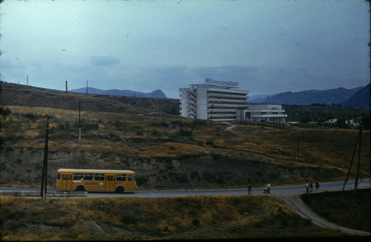 Вид из Генуэзской крепости на окраины Судака и автобус ЛиАЗ-677.