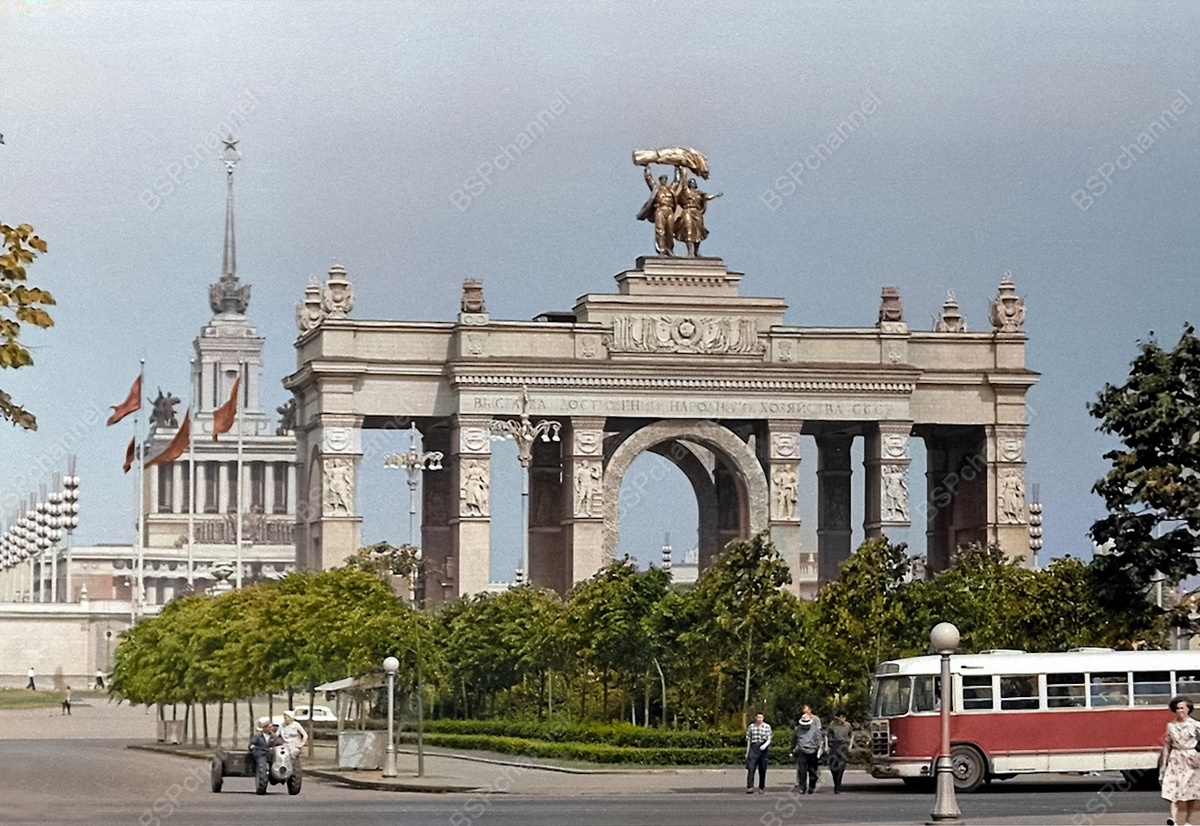 Для любого человека самая яркая ассоциация с ВДНХ — это величественная арка парадного входа, ведущая на Центральную аллею. На вершине арки фигуры «Тракторист и колхозница» поднимают к небу аллегорический сноп колосьев на высоту 32 метров — символ единства тяжёлой промышленности и сельского хозяйства, опор советской экономики. Выполненная в духе имперской архитектуры Древнего Рима, арка стала знаком славы победившего в войне народа. Она подчеркивает статус СССР как триумфатора и отражает новый масштаб Выставки достижений народного хозяйства, преобразованной в 1954 году в грандиозный пантеон советского могущества.