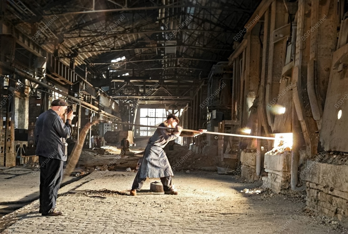 Введение кислорода в мартеновскую печь для ускорения процесса плавки в первом мартеновском цехе Московского металлургического завода «Серп и молот». Москва, 1959 год.