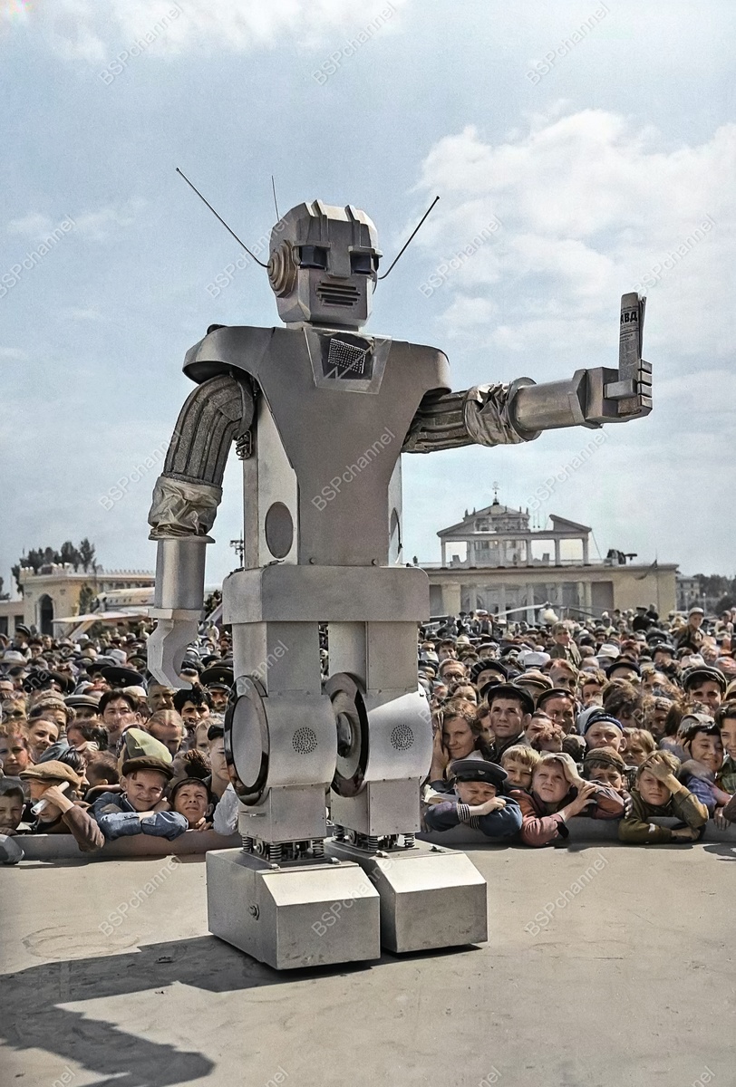 Робот РУМ - радиоуправляемая модель у входа в павильон "Электрификация". Москва, 1959 год.