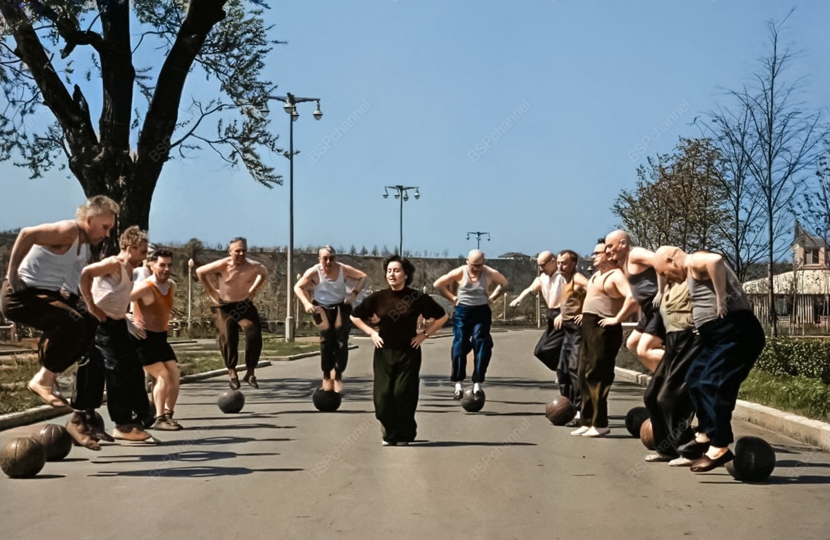 Занятия группы мужчин старшего возраста под руководством преподавателя И.И. Клыбиной на Центральном стадионе им. В.И. Ленина. Москва, 1958 год.