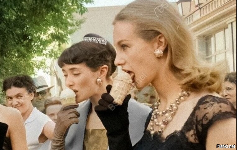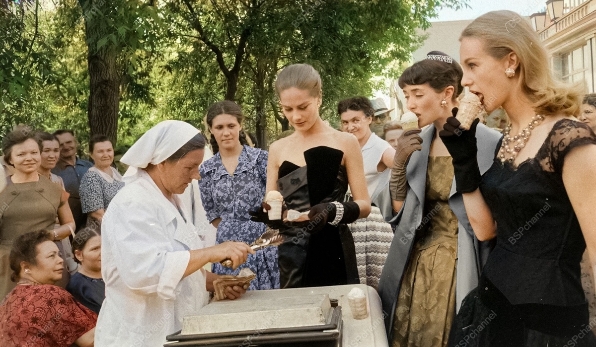 Британские модели пробуют советское мороженое в Москве, 1956 год.
