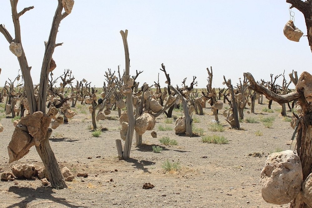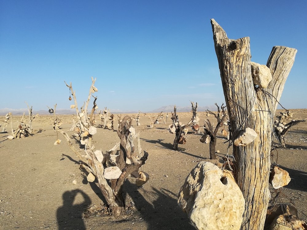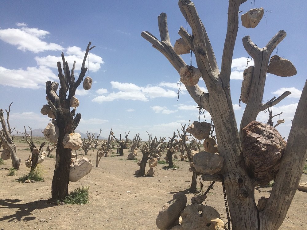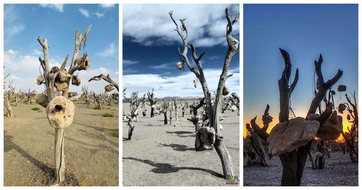 Посреди бескрайней пустыни находится этот невероятный сад каменных деревьев. Сотни высоких засохших деревьев простираются далеко по пескам, и с ветвей каждого свисают камни, большие и малые, некоторые весом более девяти килограммов. Это рукотворный рай для искателей странного, и зрелище это поистине завораживающее.