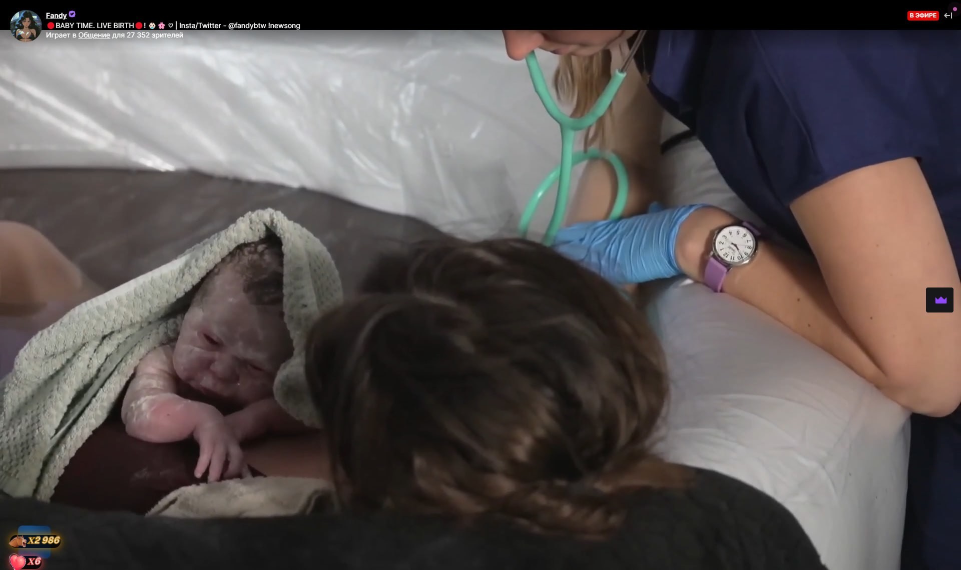 Стримерша Fandy решила рожать в домашних условиях в прямом эфире. Роды проходили в "бассейне", который стоял в квартире. Имя ребёнку решили выбрать путём голосования в чате.