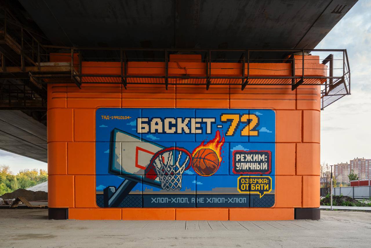 Художник Андрей Топоров совместно со строительной компанией превратил опоры моста в картриджи «Денди». Один из арт-объектов – история Речпорта с краном Ганцом.