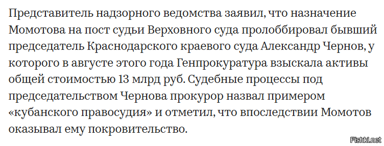 В Останкинском суде Москвы идёт процесс по иску Генпрокуратуры, выдвинувшей обвинение против бывшего заместителя председателя Верховного суда Виктора Момотова и его сообщников. В Генпрокуратуре считают, что экс-глава Совета судей РФ организовал гостиничный бизнес, уклонялся от налогов, а также осуществлял прикрытие для противоправной деятельности — «оказании интимных услуг, почасовых комнатах и саунах».
