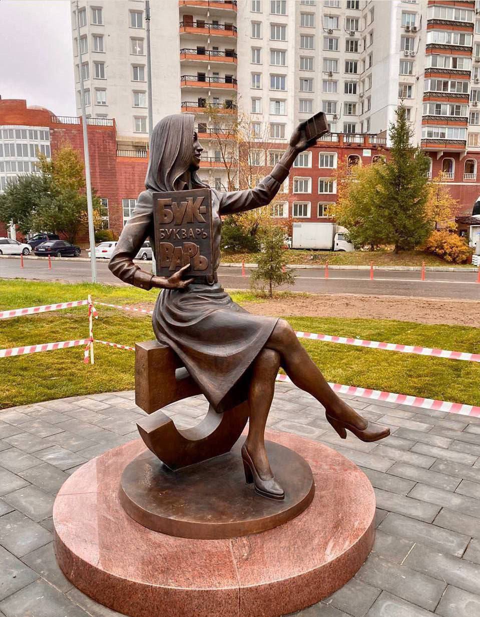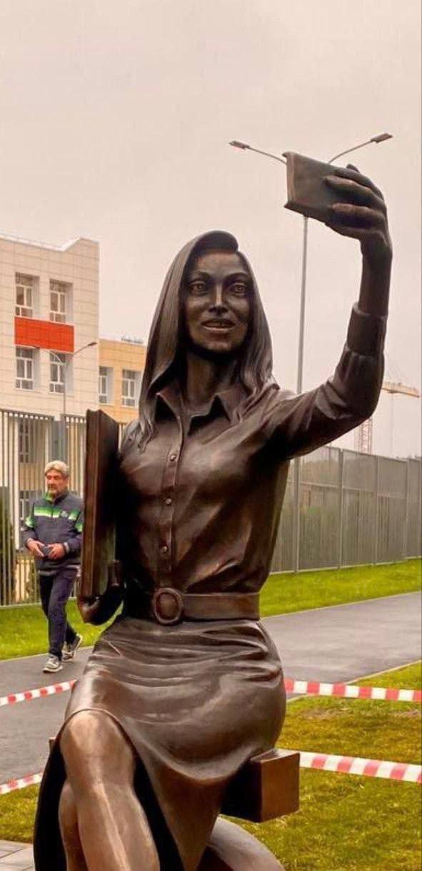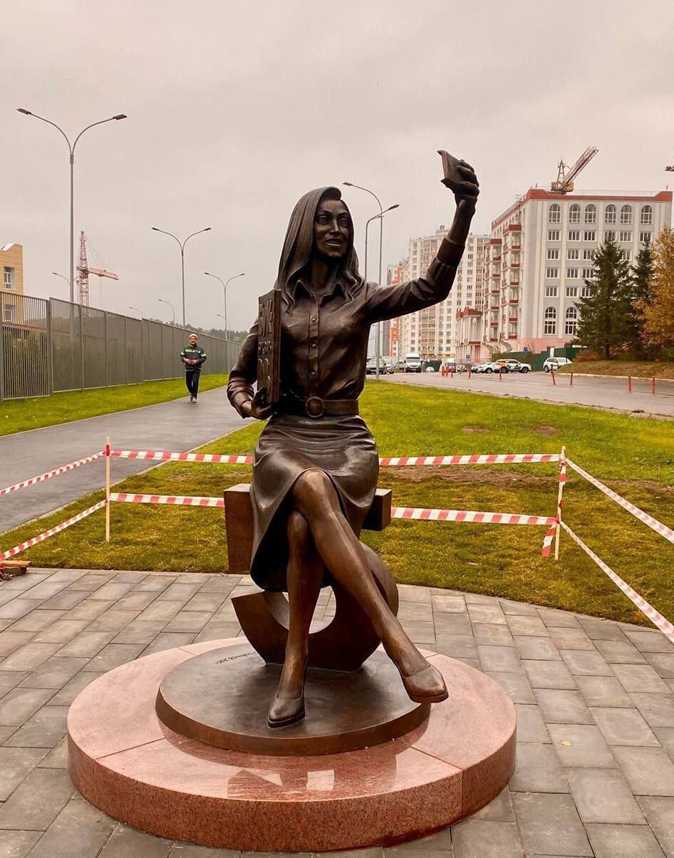 В подмосковном Дзержинском появился памятник учительнице, вызвавший неоднозначную реакцию у жителей. Скульптура изображает молодую девушку, делающую селфи с букварем в руках, сидя на гигантской цифре «пять».