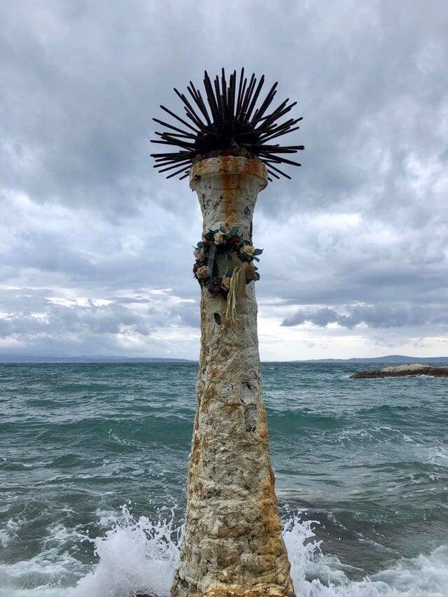 Привет! Я из Сплита, и это морской ёж. Пляж славится морскими ежами и, следовательно, чистым морем, потому что они живут только там, где он чист. Сейчас их меньше, поэтому плавать можно. Вот чему посвящена статуя. Насколько я знаю, в этом нет скрытого смысла, это художественная инсталляция. Венок не всегда там, поэтому я думаю, что это для кого-то конкретного. Не могу найти имя художника, я дам вам знать, если я это сделаю.