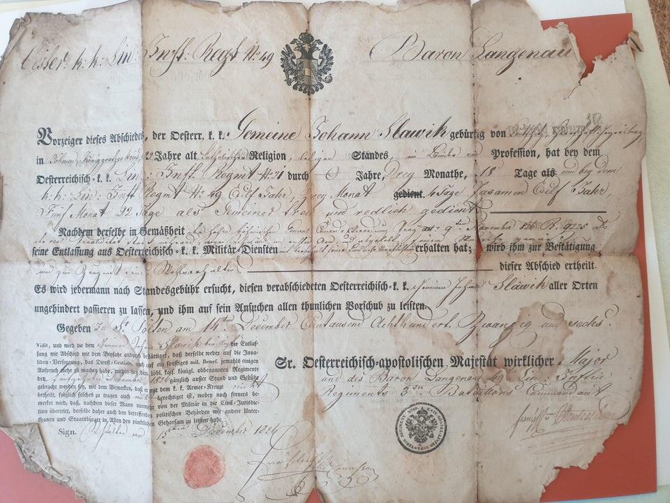 Это официальное письмо об освобождении богемского солдата по имени Иоганн Славик из армии Австрийской Империи после 11 лет, 5 месяцев и 22 дней службы в двух разных пехотных полках. Оно от 15 декабря 1826 года, а также действует как рекомендательное письмо и пропуск.