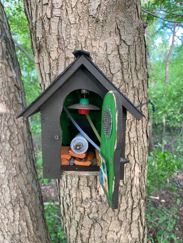 14. «Почему у этого фальшивого скворечника есть какие-то технические предметы внутри? (Лес у озера неподалёку от Берлина, Германия)