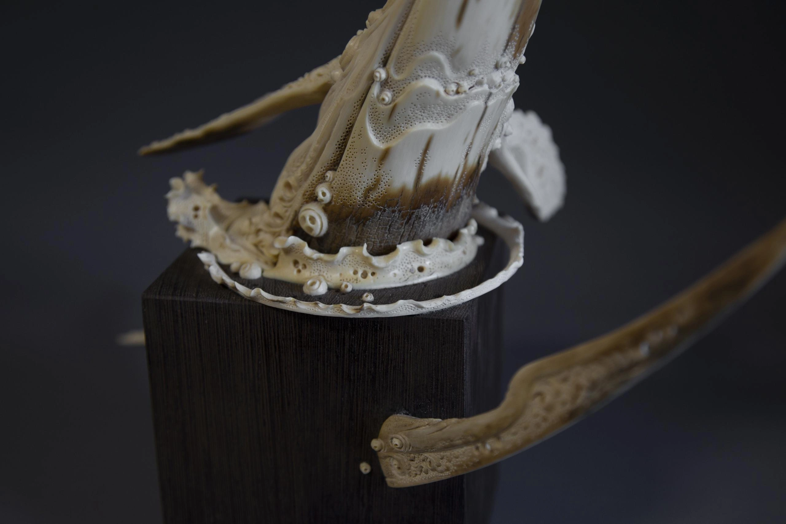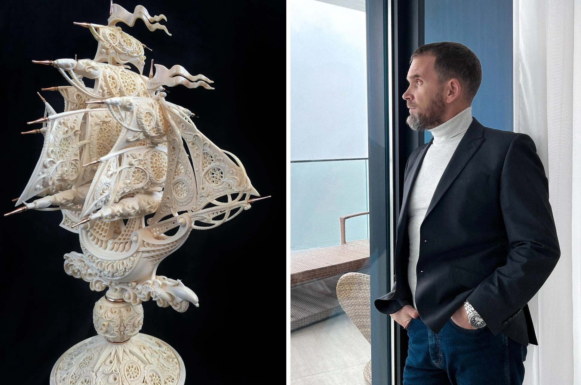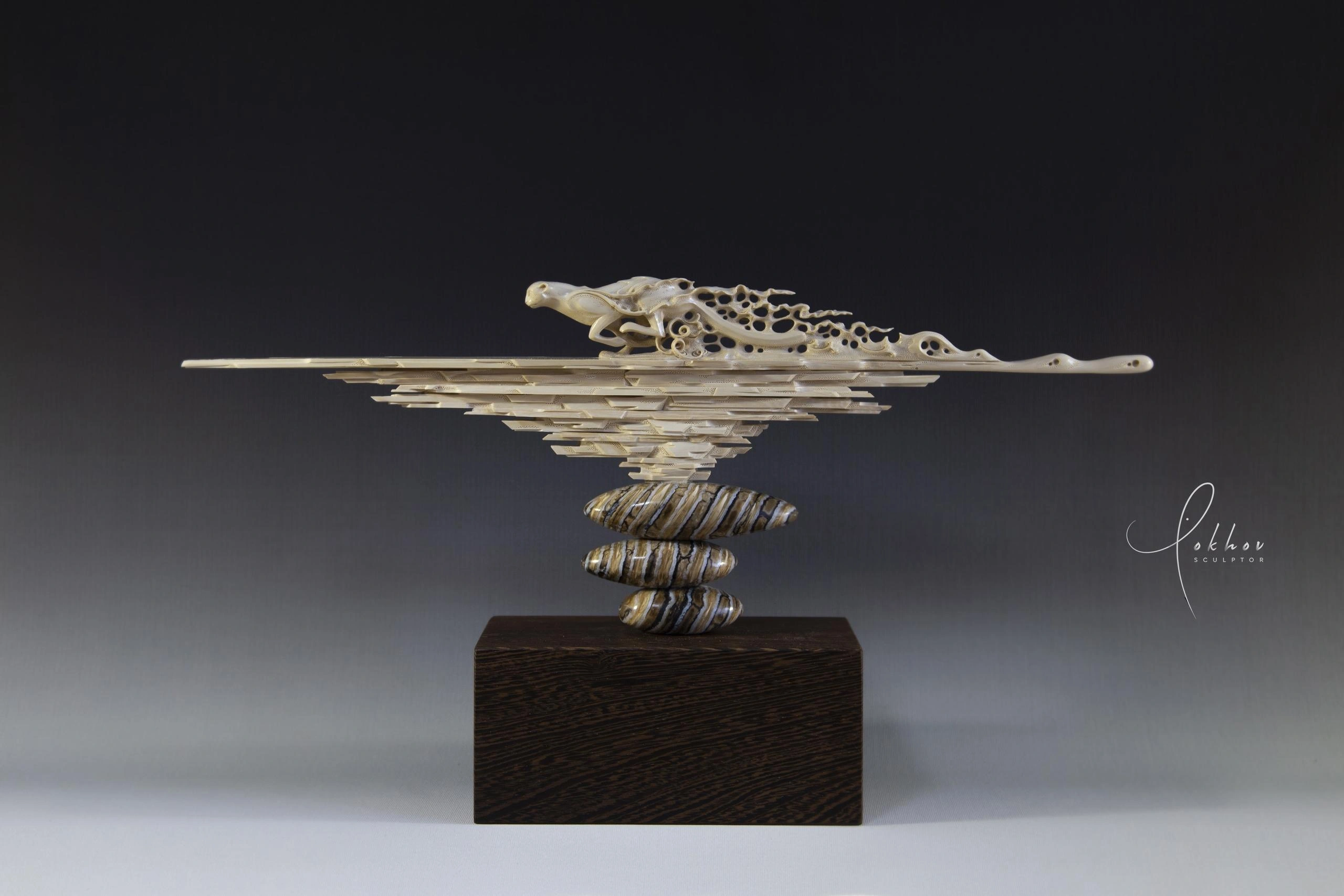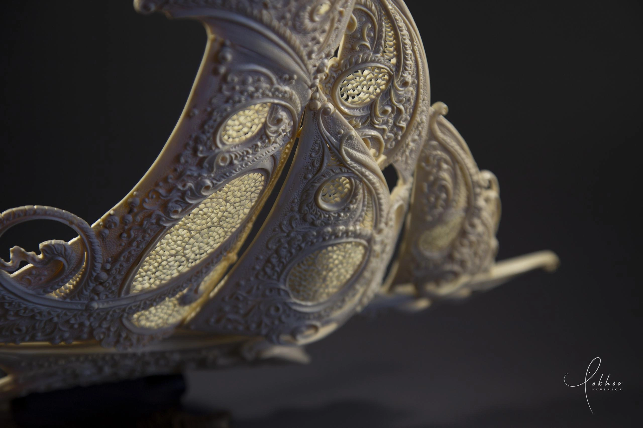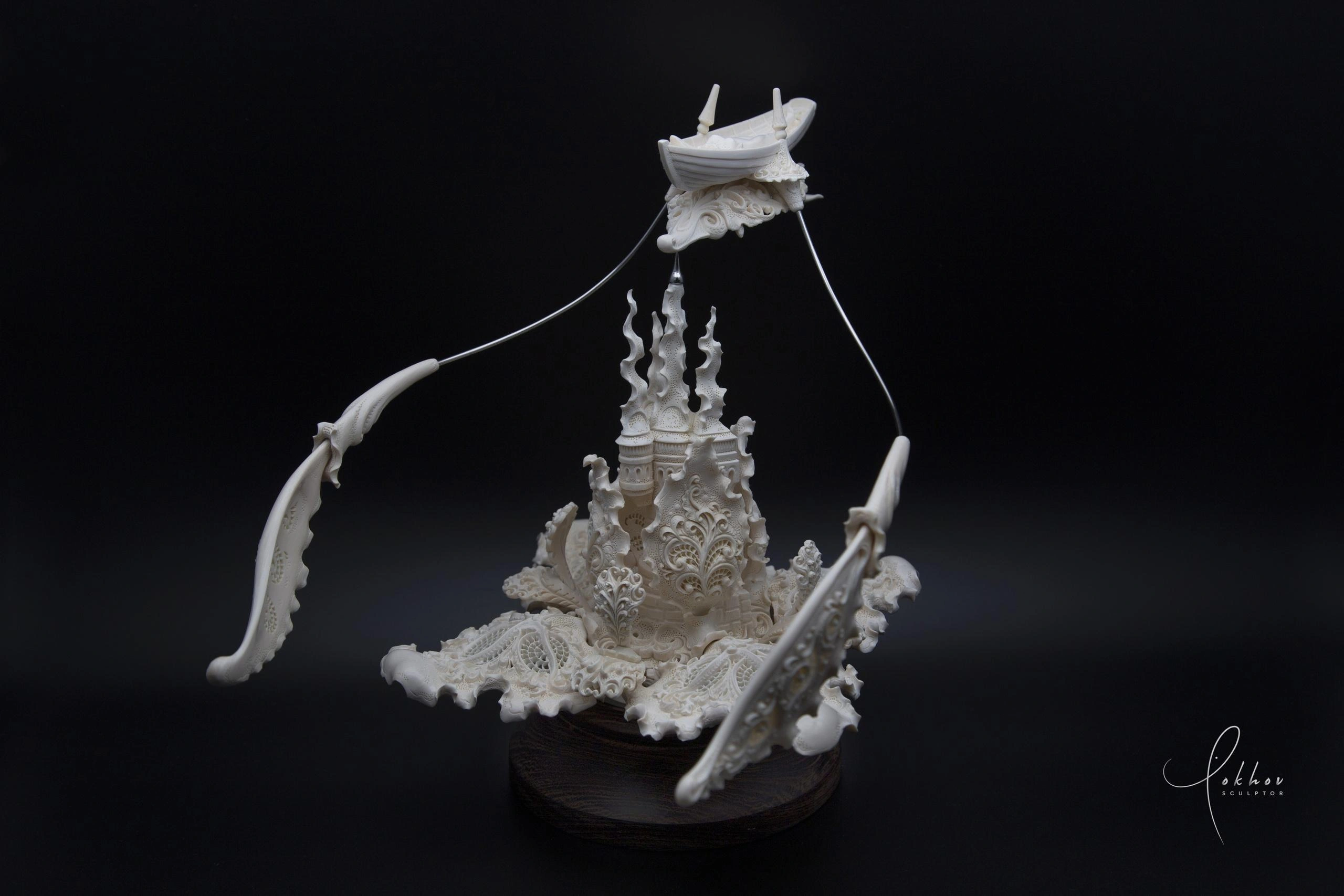 Поэтому практически за каждой скульптурой из кости — своя история. Например, одну из работ мастер посвятил дочери, которая в детстве любила представлять себя русалкой. Композиция подвижная, объемная, хрупкая — сложно представить, насколько кропотливым был процесс. Лодочка с русалкой крутится вокруг оси, вращая плавники вокруг подводного царства.