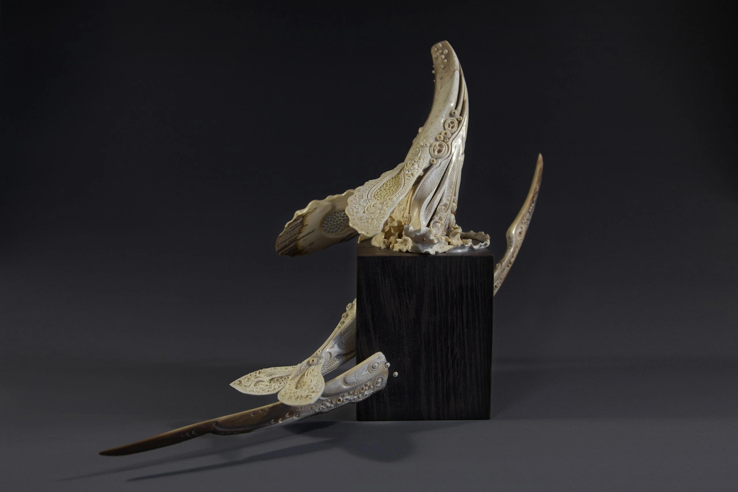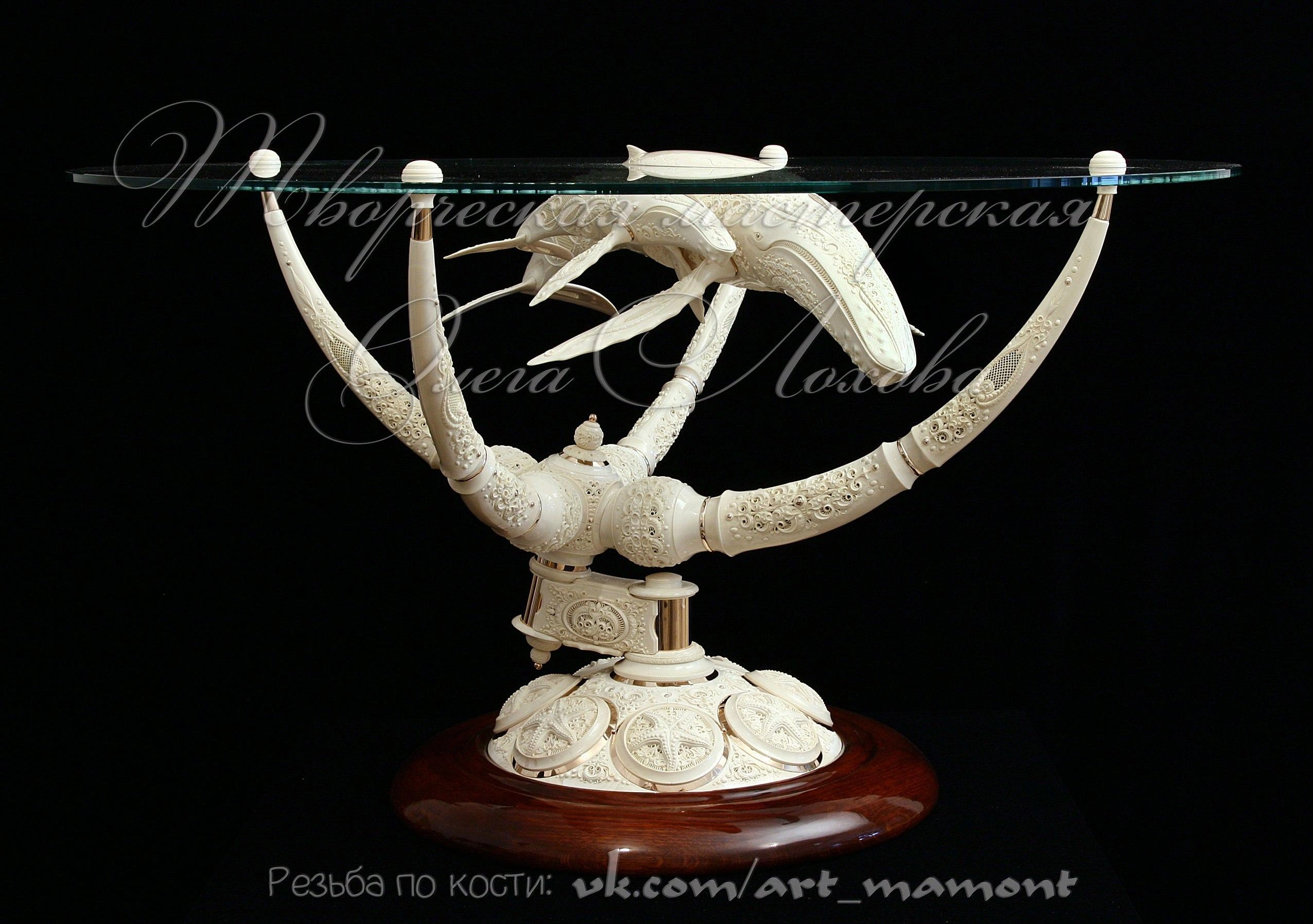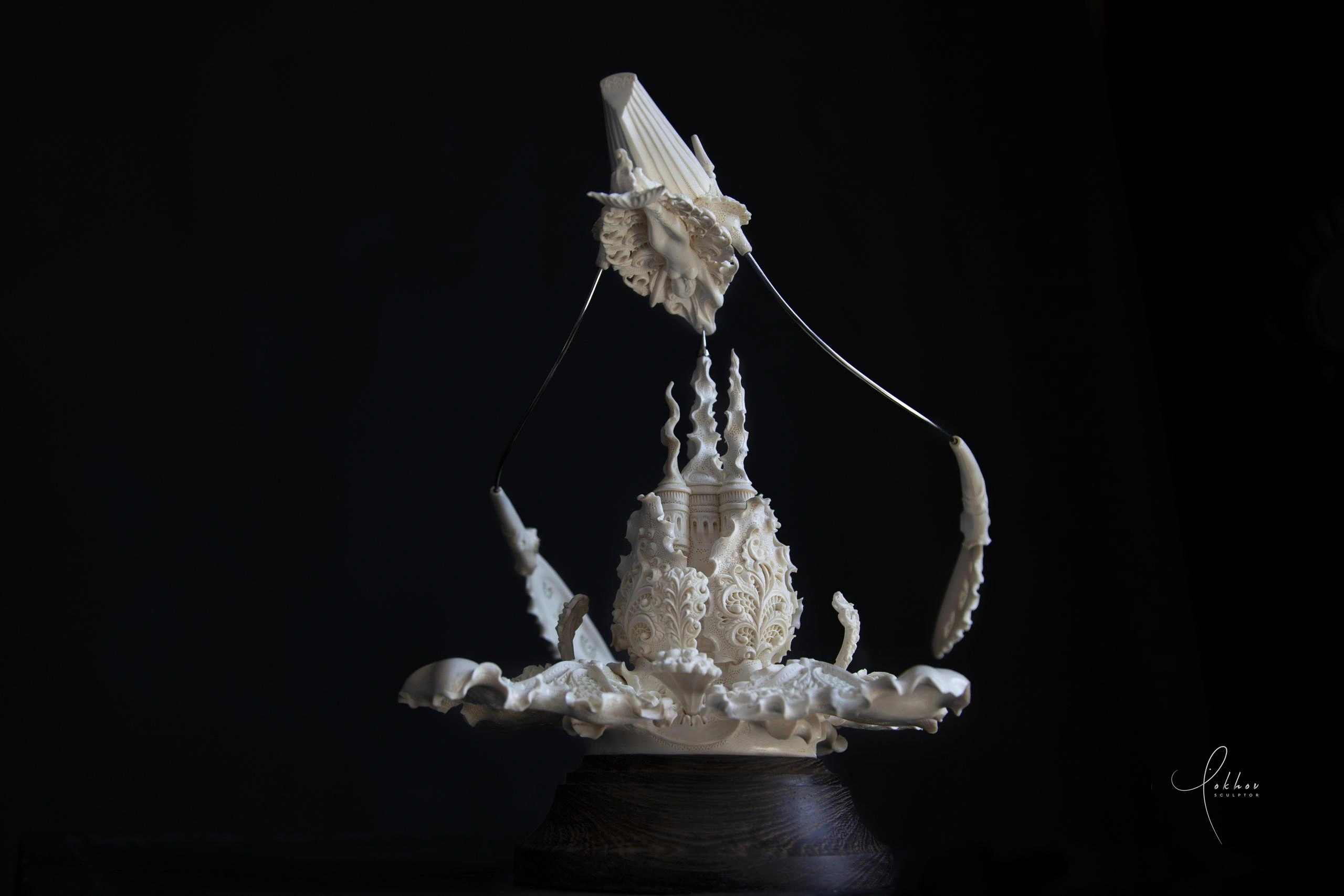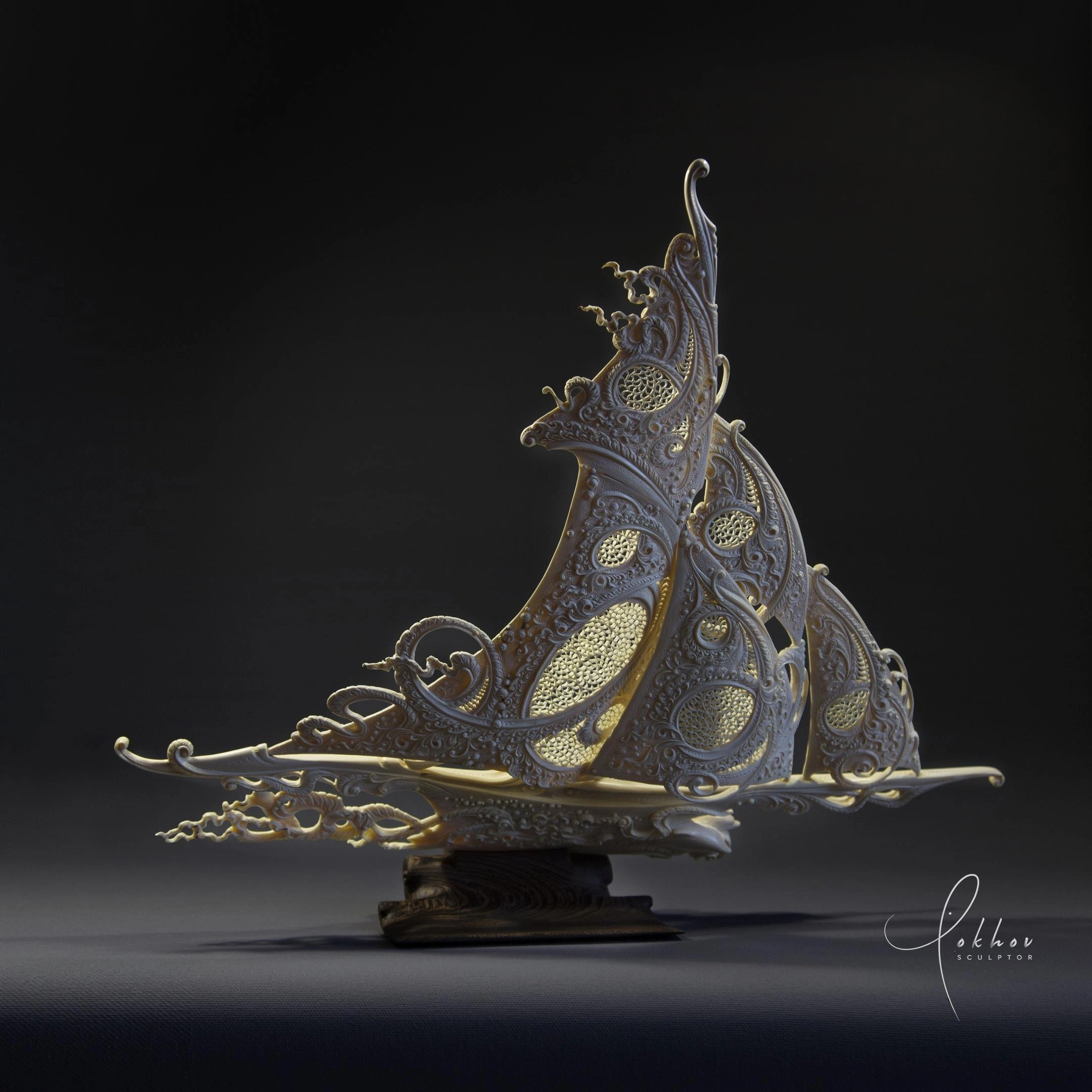 Поэтому практически за каждой скульптурой из кости — своя история. Например, одну из работ мастер посвятил дочери, которая в детстве любила представлять себя русалкой. Композиция подвижная, объемная, хрупкая — сложно представить, насколько кропотливым был процесс. Лодочка с русалкой крутится вокруг оси, вращая плавники вокруг подводного царства.