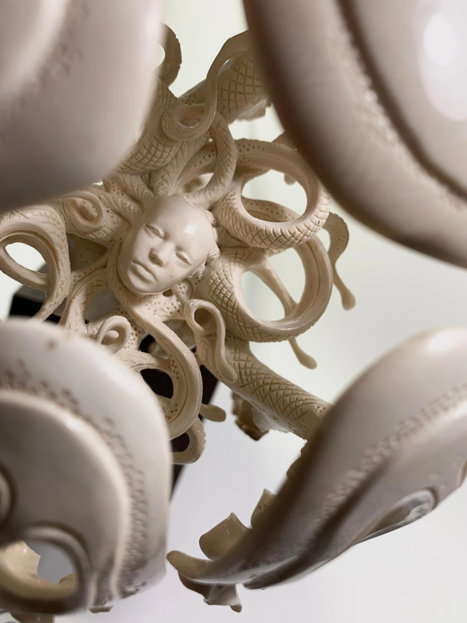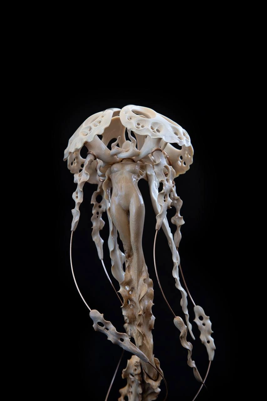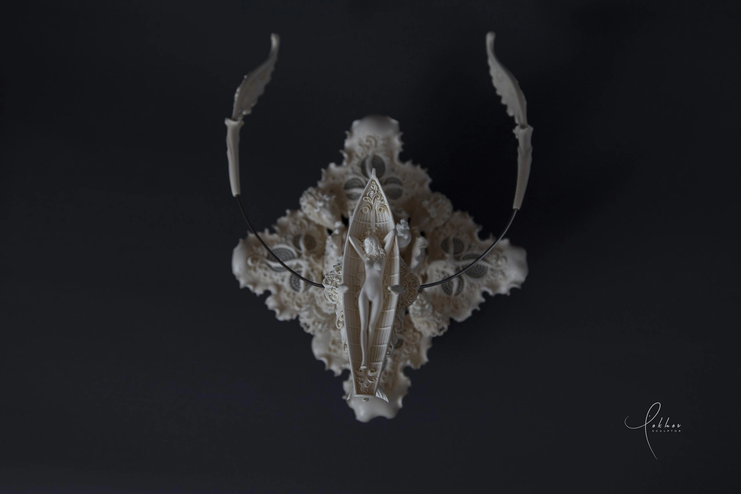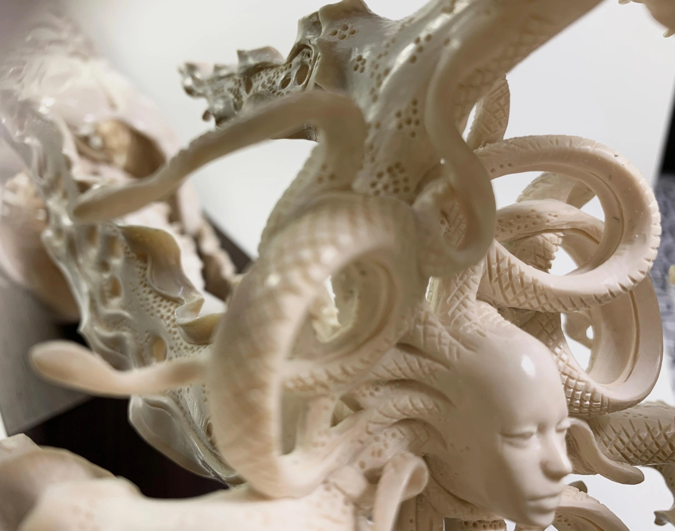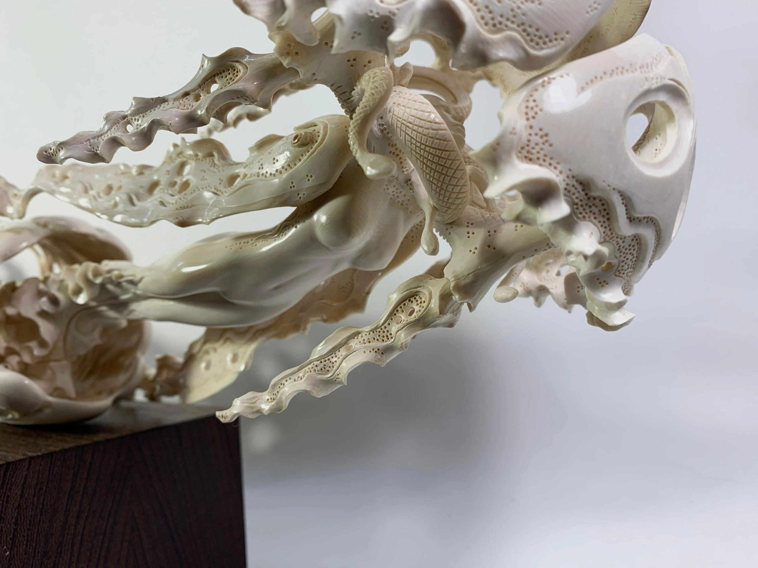 Поэтому практически за каждой скульптурой из кости — своя история. Например, одну из работ мастер посвятил дочери, которая в детстве любила представлять себя русалкой. Композиция подвижная, объемная, хрупкая — сложно представить, насколько кропотливым был процесс. Лодочка с русалкой крутится вокруг оси, вращая плавники вокруг подводного царства.