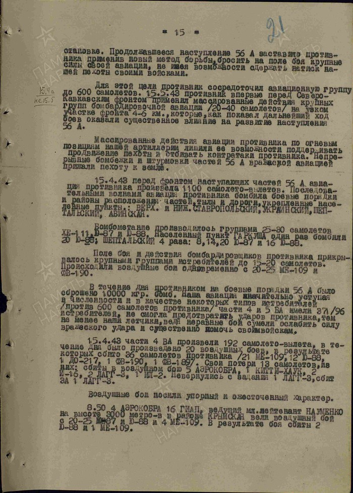 Здравствуйте Уважаемые читатели! Сегодня я приведу пример того, какое порой значение имеет наличие авиации, да ещё и в больших количествах для обороняющихся войск. Так, 14 апреля 1943 года началась операция по прорыву Голубой линии на Кубани. Наземные войска 56-й Армии после арт подготовки при поддержке танков пошли вперед и смогли значительно продвинуться в районе станицы Крымской (ныне город Крымск). Оказавшись перед лицом развала фронта, немцы стягивают авиацию и, учитывая, что 15 апреля распогодилось, а накануне шли дожди, начинают утюжить советские позиции, действуя группами по 20-40 бомбардировщиков под прикрытием истребителей. Причем утюжили позиции РККА по фронту всего 4-6 километра, совершив 1100 самолето пролетов за день, с нашей стороны было 192 самолёто вылета, тем не менее Соколы Сталина вели бои и заявили о сбитии 36 самолётов врага: 21 Ме-109, 12 Ю-88, один До-227 и по фоккеру 189 и 190 модели. Причем отмечу, что Фокке-189, он же "рама", был весьма нелегкой целью для истребителей, и предвестником беды для наших подразделений. Так как после пролета этой разведывательной машины враг наносил удары.