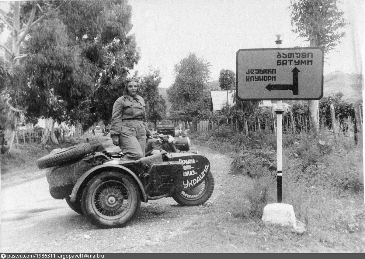 Мотоциклист у поворота Батуми - Клухори, в ущелье реки Кодор. В роли транспортного средства - трофейный Цюндапп.