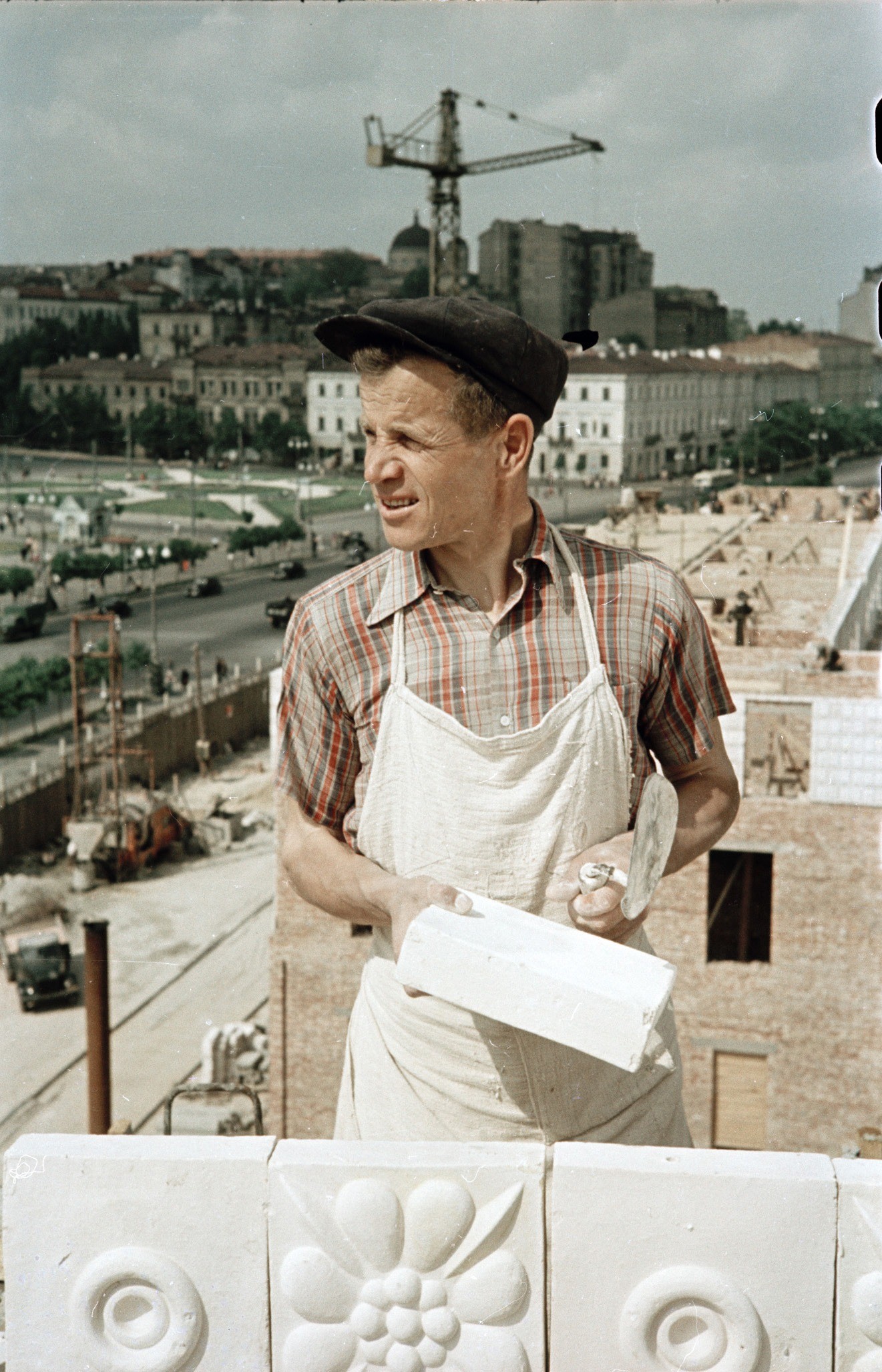 Киев. Продолжается послевоенное восстановление Крещатика. На фото - каменщик Федор Иванович Кравчук.