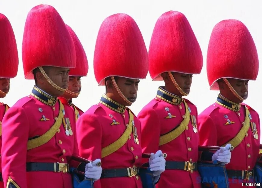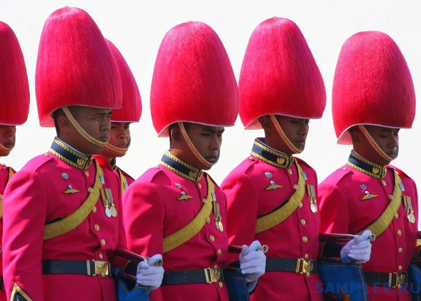 Без попыток подколоть, но всего сто лет войска Таиланда занимались тем, что разгоняли птиц из столицы, потому что те своими криками мешали государю спать. Сейчас занятия у армии Таиланда очень серьезные, но смотреть без улыбки на их головные уборы разных цветов, словно грибочки вышли погулять, не всегда получается.