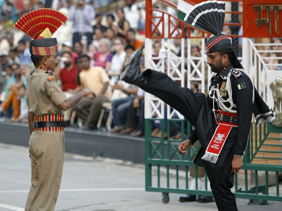 А на границе Индии и Пакистана ежедневно проходит очень зрелищная смена караула, где можно также увидеть пакистанских военных в полном мундире. Церемония такая красочная, что кажется, что воины красуются друг перед другом, как павлины.