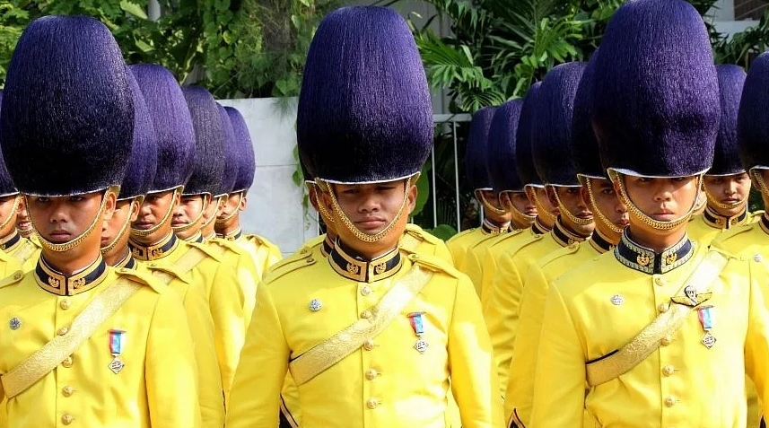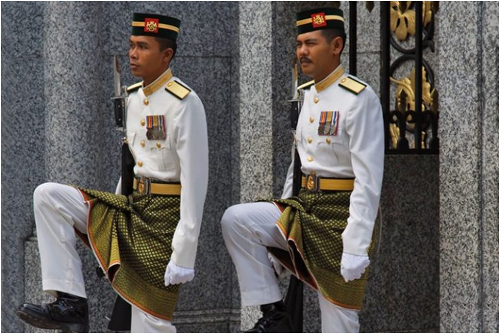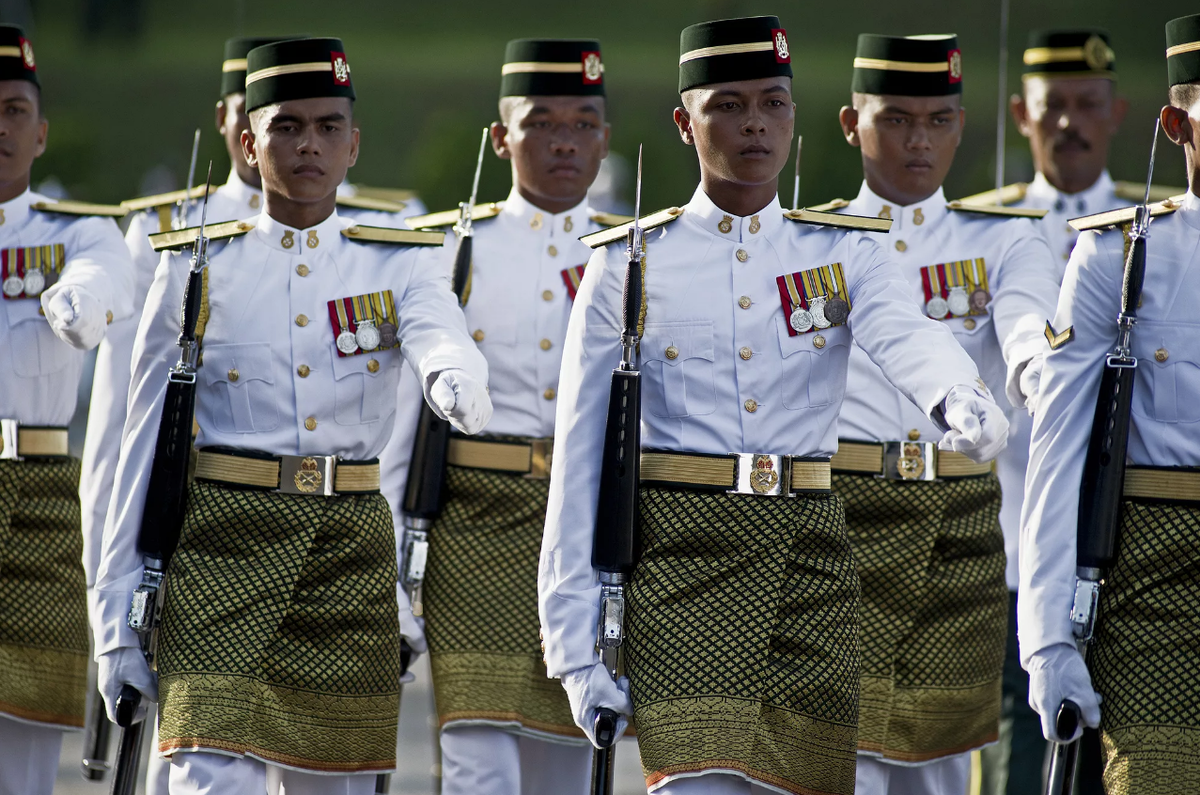 В королевском полку Малайзии шикарная белая форма с золотым воротником. А из национального колорита тут… юбка, которая надеваться поверх красивой формы. Юбка, к слову, тоже очень красивая, в моде военные понимают.