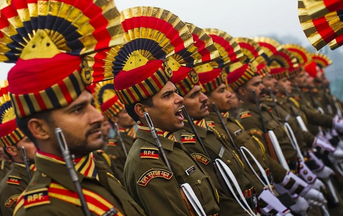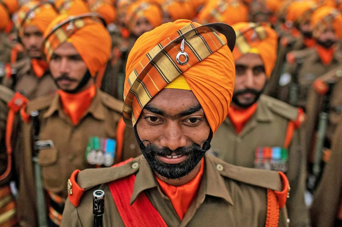 Индия поистине огромная страна, потому в ней нет единой военный формы, все зависит от фантазии конкретного штата. Потому пограничники носят здесь шапки с гребнями, прямо как павлины.