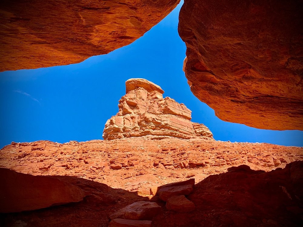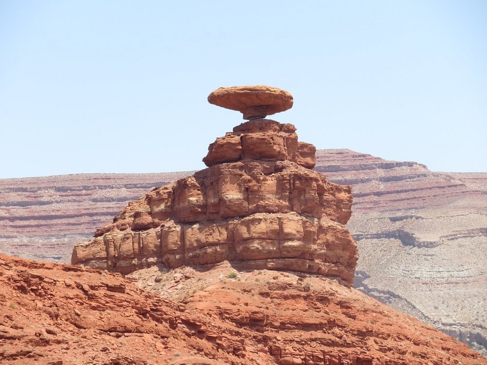 Его силуэт, узнаваемый с первого взгляда, и правда напоминает перевёрнутое сомбреро. Гигантская, диаметром 18 метров, шляпа из оранжево-красного песчаника уверенно балансирует на тонкой ножке из более мягких сланцев.