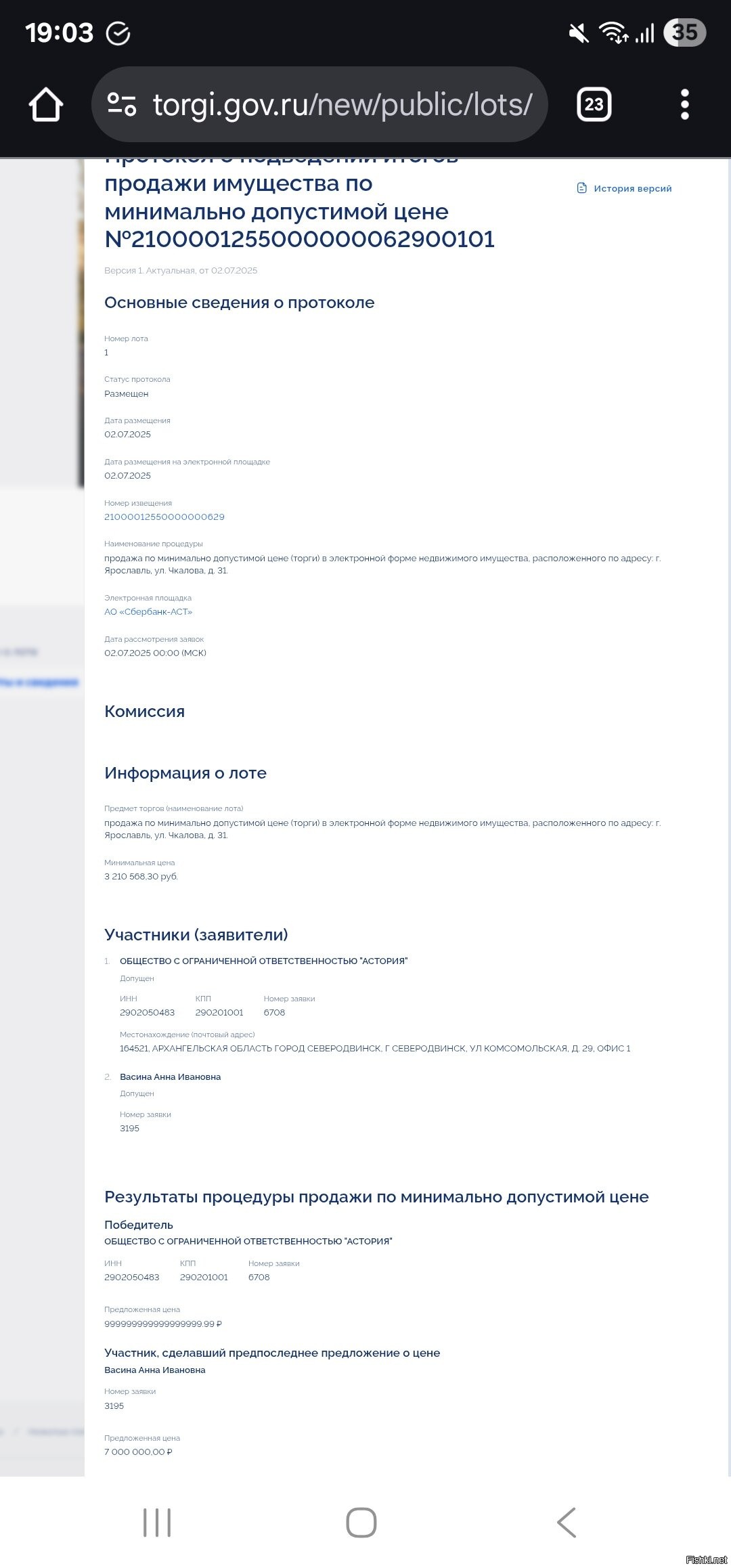 «Общество заявило фантастическую сумму — 999 квинтиллионов 999 квадриллионов 999 триллионов 999 миллиардов 999 миллионов 999 тысяч 999 рублей 99 копеек (включая налог на добавленную стоимость). Предложенная цена соответствовала установленным правилам проведения торгов, поэтому по итоговому протоколу общество было признано победителем», — уточнили в антимонопольной службе.